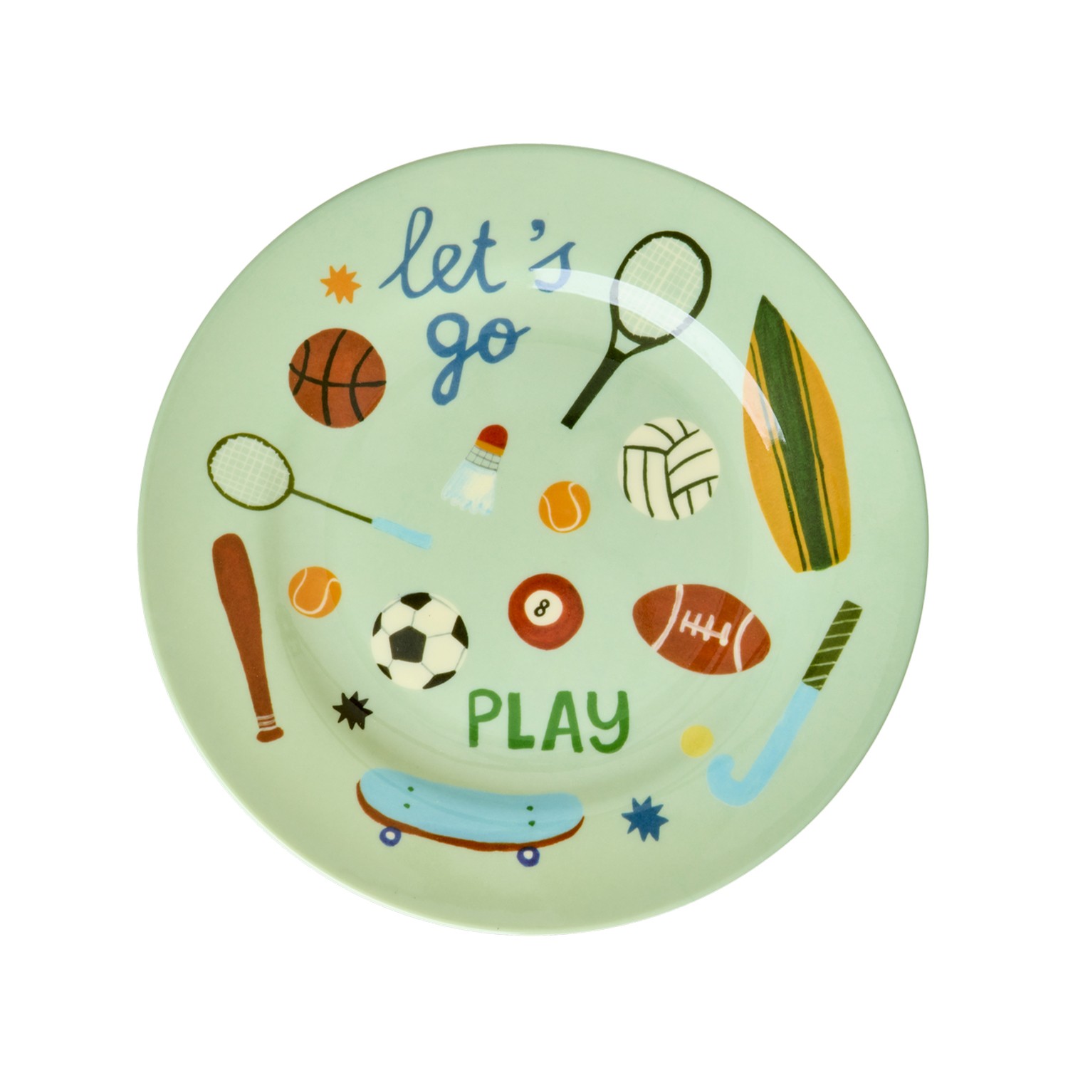 Piatto da dolce in melamina di colore verde pastello con divertente multi fantasia a tema Sport. Questo piatto è classico e fresco nella sua forma, pratico da usare sia all'interno che all'esterno, bello anche da appendere alla parete per dare un bel tocco di colore all'ambiente.
