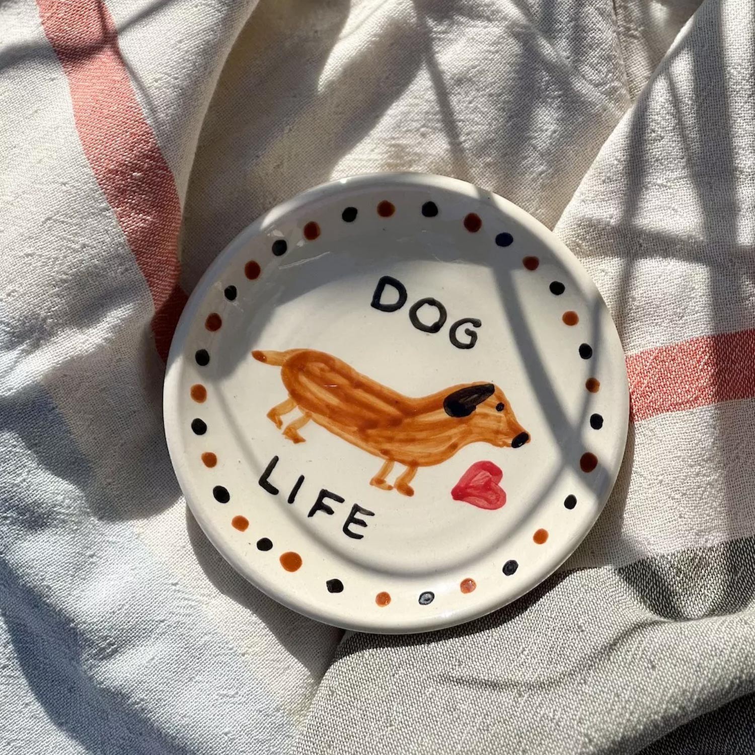 Questo piattino dalla forma circolare irregolare presenta un adorabile bassotto disegnato al centro con la scritta Dog Life e una fantasia a pois sul bordo, perfetto per servire la frutta o il dolce agli ospiti. Realizzato in ceramica color panna, molto resistente all'uso quotidiano e lavabile in lavastoviglie, è un'idea regalo perfetta per gli amanti dei nostri amici a quattro zampe.