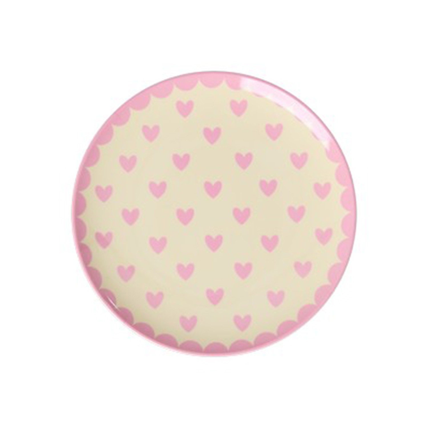 Piccolo piatto da dolce circolare realizzato in melamina con bordo rosa effetto smerlato e graziosa fantasia di cuoricini rosa su sfondo color crema, perfetto per una fetta di torta o uno snack.