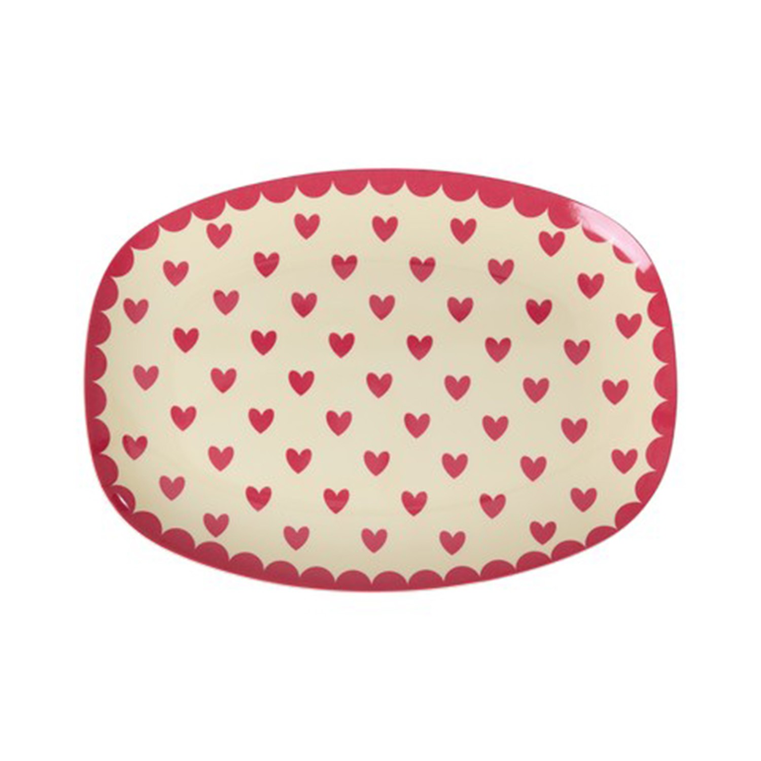 Dalla collezione Rice, piatto ovale da dessert in melamina color crema decorato con bordo rosso effetto smerlato e con graziosa fantasia a tema cuoricini. Ideale per servire il dolce o la frutta in tavola con quel tocco estivo in più pensando alle vacanze.