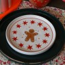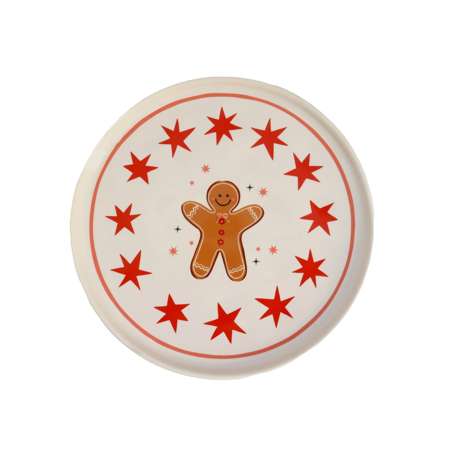 Realizzato in ceramica lucida con un design pulito e d'impatto, questo piattino celebra i simboli più amati del Natale: al centro brilla l'inconfondibile Omino di Pan di Zenzero, sorridente e pronto per la festa, completo di decorazioni a glassa rossa e bianca, circondato da una corona di grandi stelle rosse brillanti, creando un motivo dinamico e festivo che ricorda i giochi pirotecnici invernali.