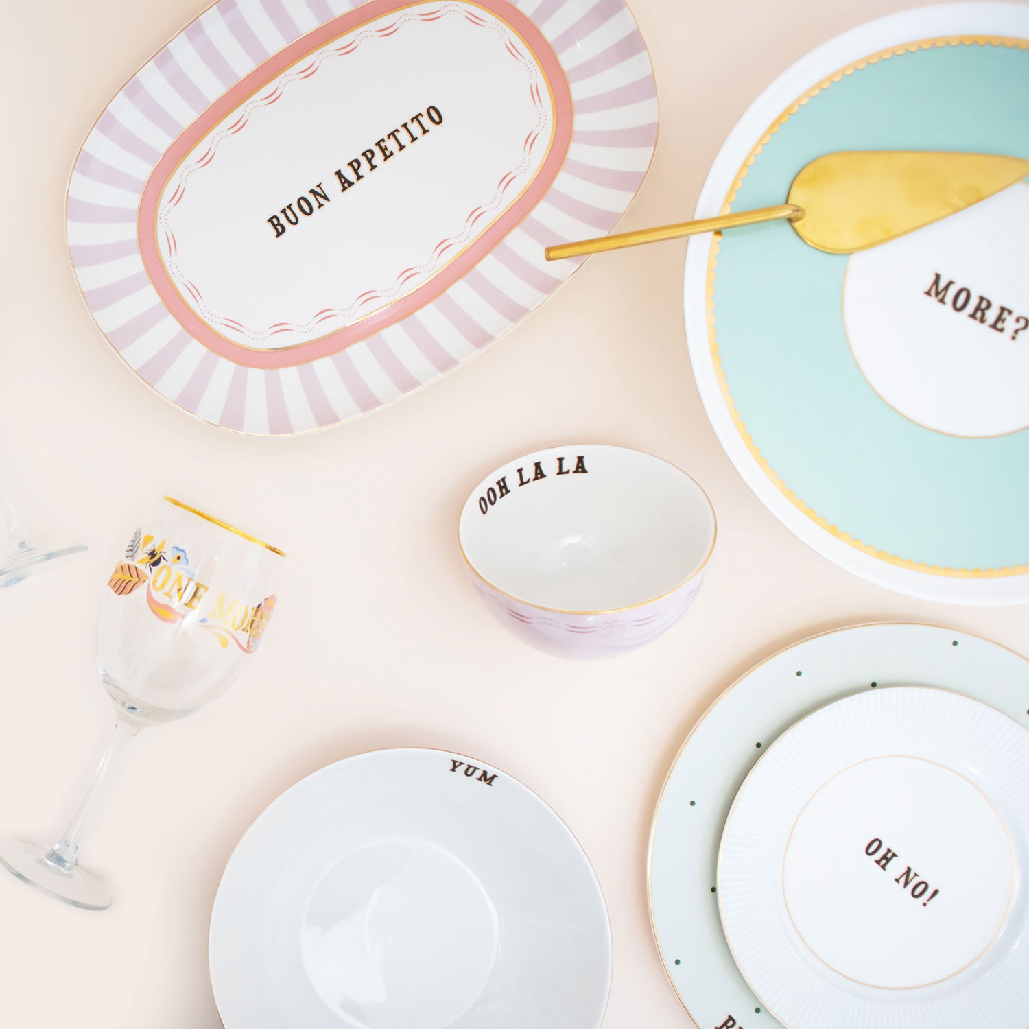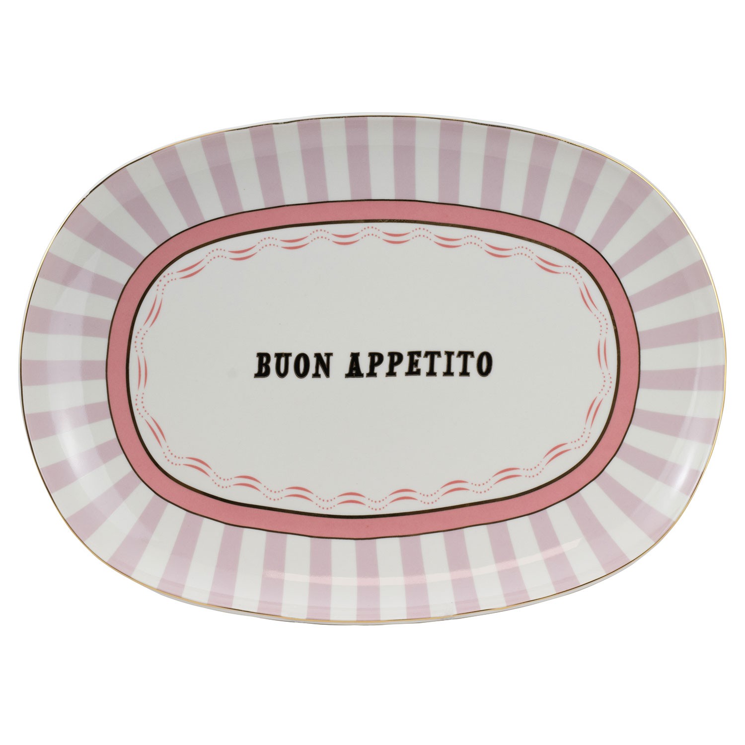 Questo grazioso e grande piatto ovale da portata in porcellana con scritta centrale Buon Appetito e pregevole bordo dorato è un pezzo davvero unico ed originale di arte funzionale per la tua tavola by Yvonne Ellen. E' consigliato il lavaggio a mano.