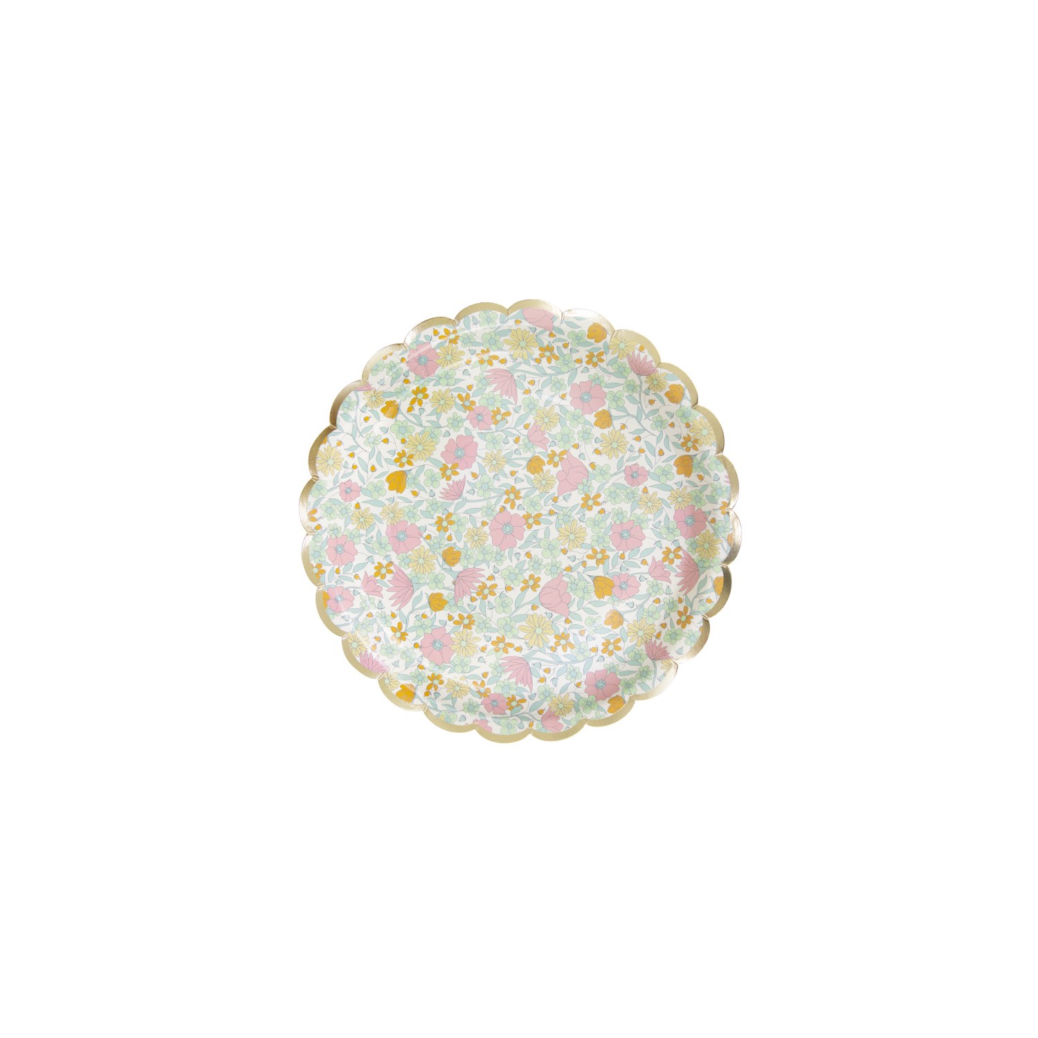 Graziosi piatti di carta decorati con fiorellini colorati, margherite e con fine bordo dorato smerlato. Questi piattini in perfetto stile shabby chic sono ideali anche per feste a tema floreale, baby shower, picnic in campagna. Abbinali ai nostri tovaglioli e bicchieri a tema!