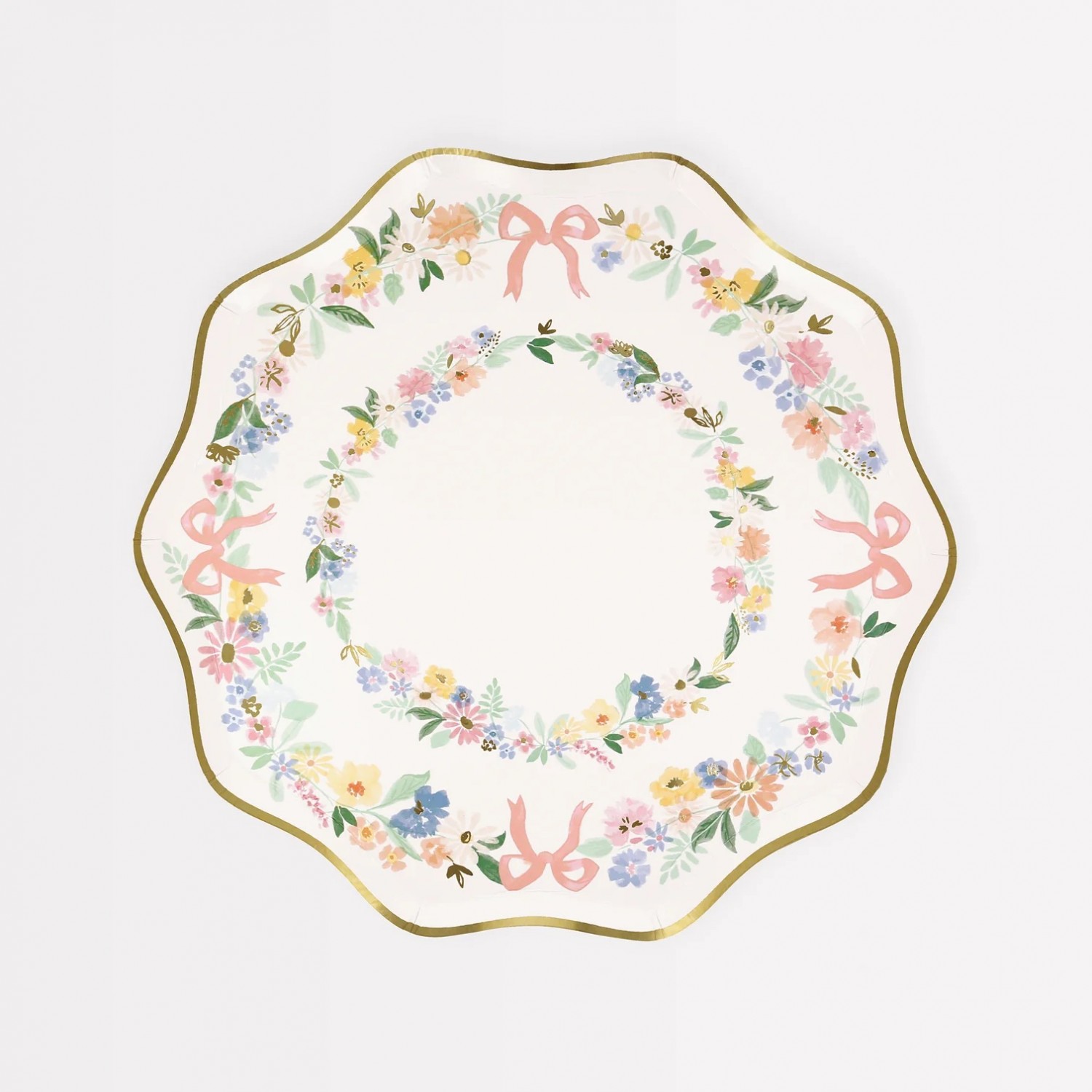 Se sei alla ricerca di un set di piattini di carta per organizzare una festa, ti innamorerai di questi splendidi piattini a fantasia floreale! L'elegante combinazione di fiori acquerellati e fiocchi dai sognanti colori pastello, è perfetta per le feste in giardino, gli addii al nubilato o per raffinati pranzi pasquali. I piattini di carta sono impreziositi con un bordo ondulato in lamina d'oro e sono perfetti da abbinare a bicchieri di carta e tovaglioli della stessa collezione. La confezione di piattini di carta è composta da 8 pezzi.