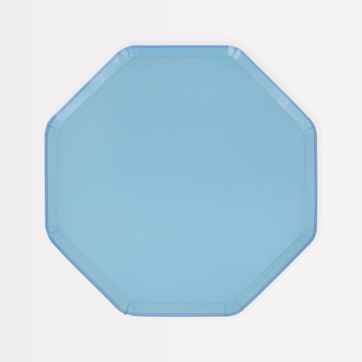 Se stai organizzando una festa particolarmente colorata, allora questi piatti faranno al caso tuo! Di forma ottagonale e realizzati in carta da 450 g/m² di colore blu fiordaliso con fine bordo blu più scuro (colore presente anche sul retro per un effetto elegante), sono ideali per una festa di compleanno o qualsiasi celebrazione a tema marino in cui desideri sfoggiare una vera e propria tavolozza di colori rilassanti. Questi piatti fanno parte della nostra nuova ed elegante collezione "mix and match", da abbinare agli altri tovaglioli, piatti e bicchieri per creare un bellissimo mix di colore. Confezione da 8 in formato small.