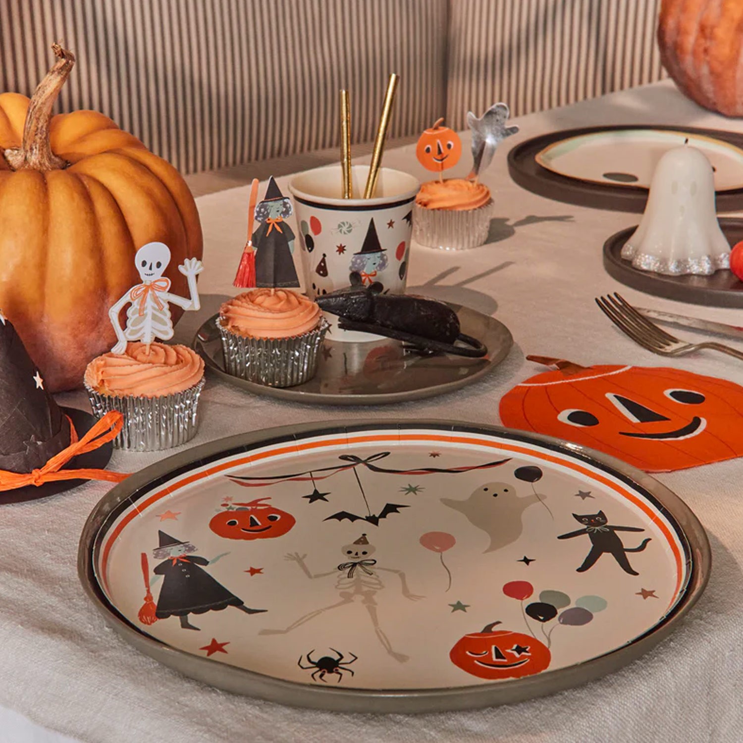 Trasforma la tua tavola in un vortice di allegria mostruosa con i nostri piatti di Halloween, perfetti per una festa indimenticabile. Questi piatti non sono solo belli, ma anche divertenti! Le icone di Halloween classiche come fantasmi, pipistrelli e gatti neri, unite a un motivo a fiocco, conquisteranno i tuoi ospiti e renderanno la tua tavola un vero successo. Realizzati in carta resistente da 450 gsm, questi piatti sono pratici e allo stesso tempo decorativi. I dettagli ramati lucidi donano un luccichio festoso che illuminerà la tua tavola. Abbinali ai nostri bicchieri e tovaglioli di carta per una super tavola a tema!