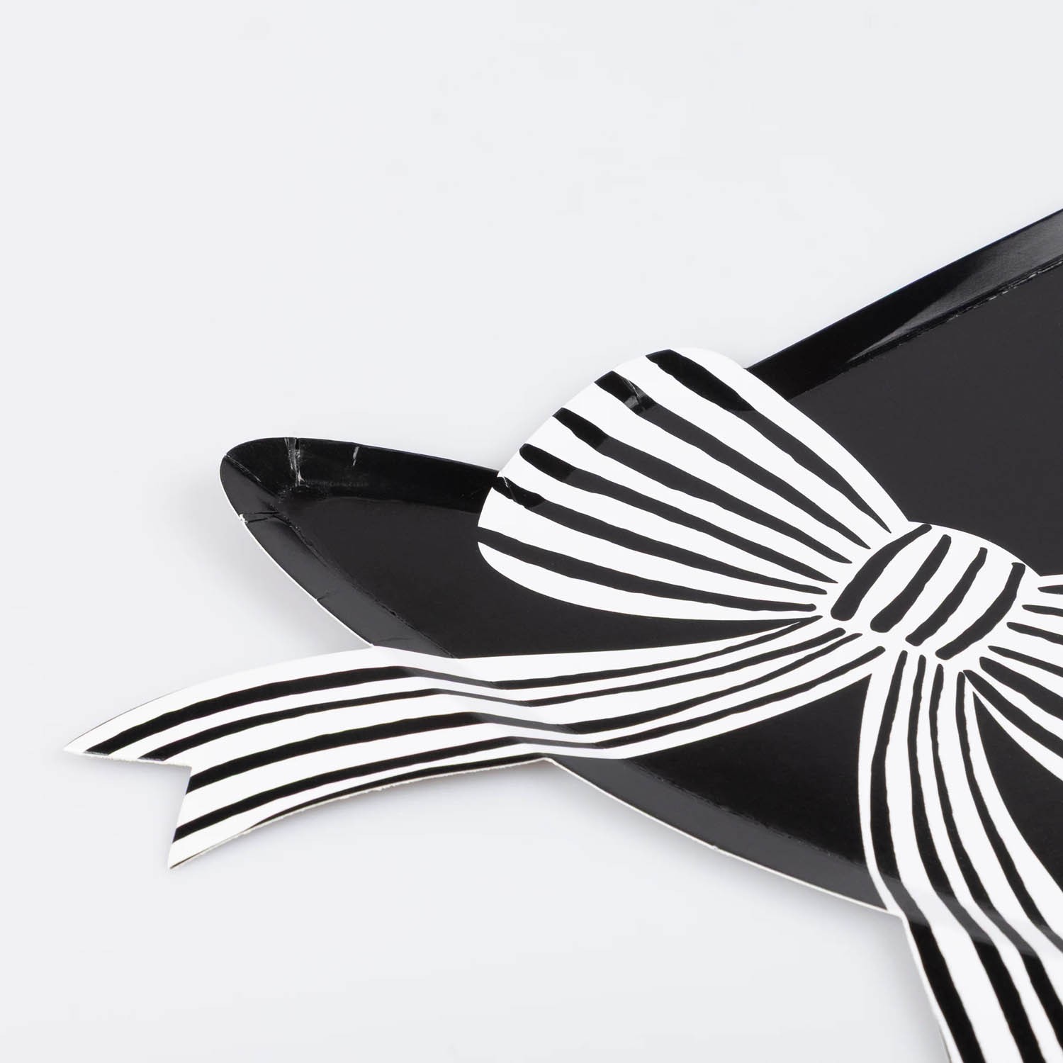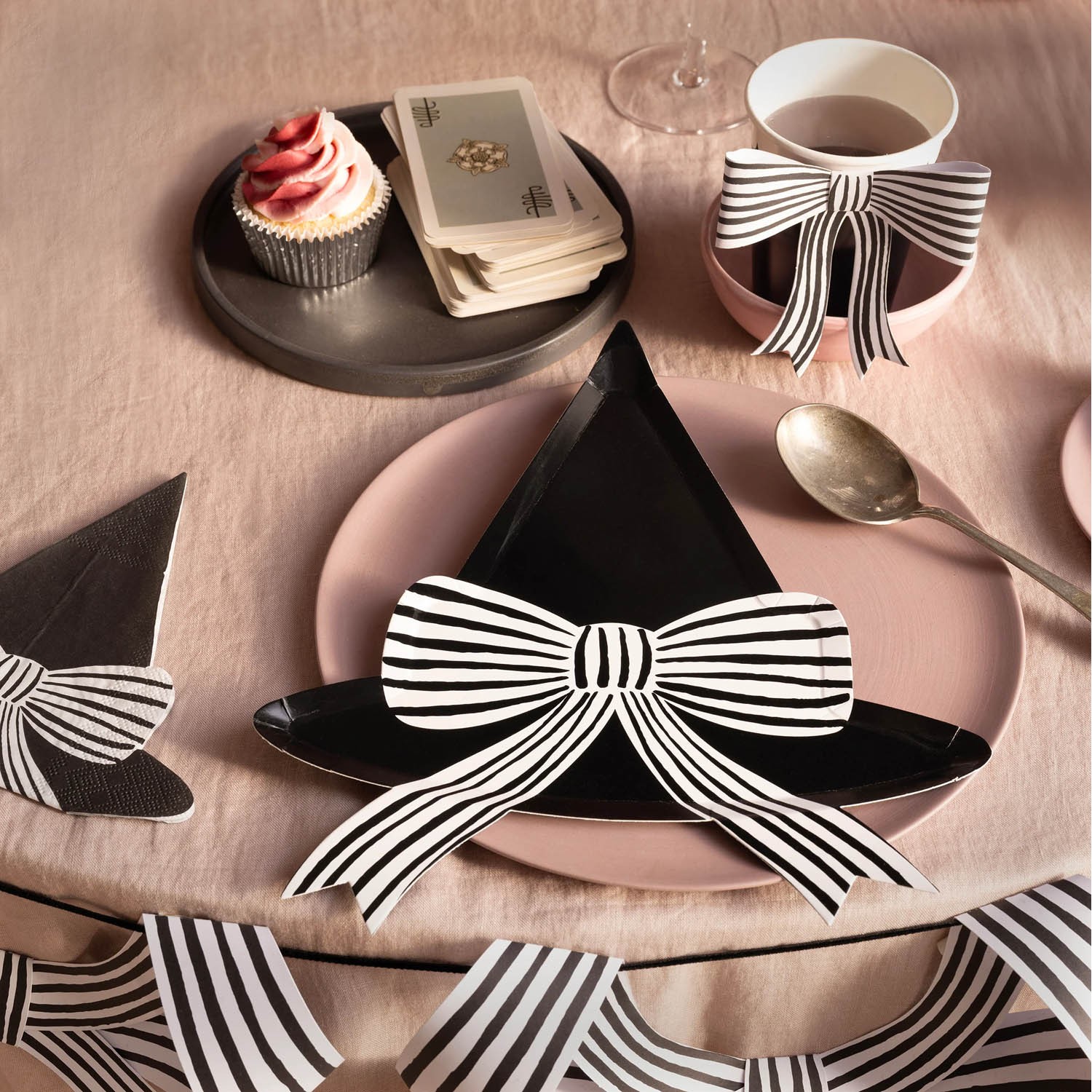 Realizzati a forma di iconico cappello da strega, aggiungono un elemento scenografico e divertente al tuo party. Il nero lucido del cappello si abbina al vivace fiocco a righe bianche e nere, richiamando atmosfere come Beetlejuice o il gotico moderno. Perfetti per un Halloween "Scary Chic"!
