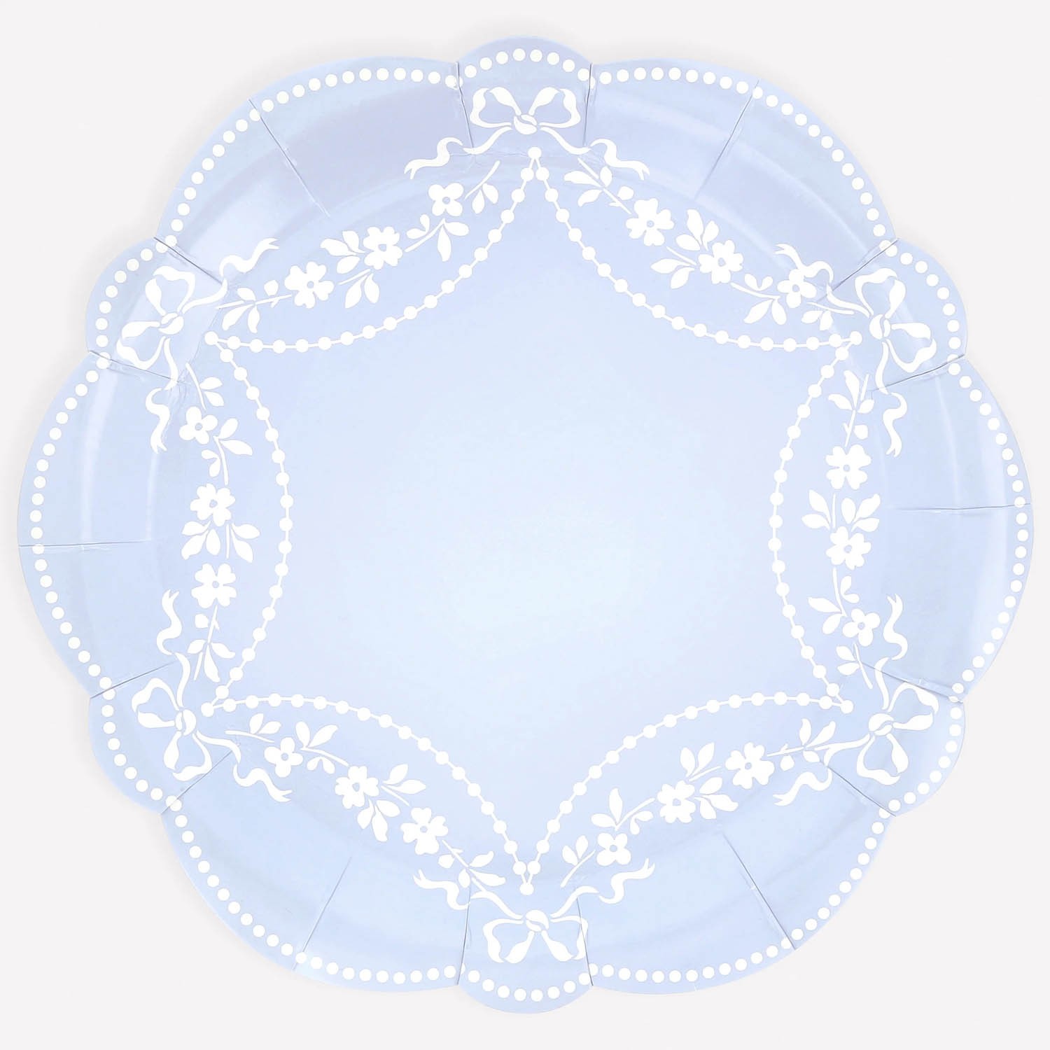 Ispirati all'eleganza classica e progettati per deliziare, questi piatti da portata blu fiordaliso presentano motivi ornamentali bianchi che richiamano i dettagli rococò. I loro bordi ondulati scultorei sono rifiniti con delicati dettagli perlati per una sobria raffinatezza. Il retro blu tono su tono completa il look, creando una tavola splendidamente coordinata da ogni angolazione. Perfetti per pranzi all'aperto, high tea, serate primaverili, baby shower o addii al nubilato, donano un tocco di eleganza. Realizzati in carta da 450 g/m², sono pratici e decorativi.