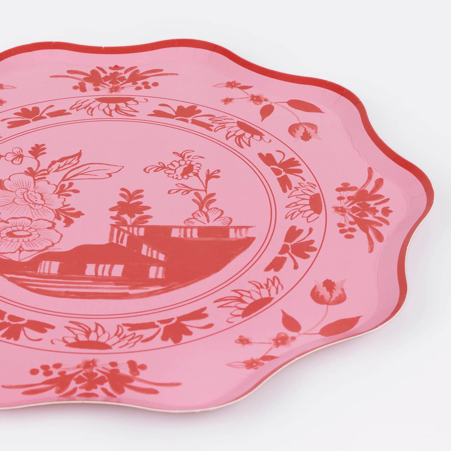Crea l'atmosfera perfetta per una festa raffinata con questi eleganti piatti di carta. Ispirati alle classiche stoviglie, presentano un'illustrazione di un ponte dipinta a mano e motivi botanici in una vivace tonalità bacca, su uno sfondo rosa ortensia. Un bordo ondulato scultoreo nella stessa tonalità di bacca aggiunge un tocco finale di grande eleganza, mentre il retro presenta una tonalità di rosa più tenue per un look raffinato da ogni angolazione. Perfetti per picnic chic, serate primaverili, addii al nubilato o qualsiasi altro evento per adulti. Realizzati in carta da 450 g/m², sono quindi sia pratici che decorativi. Splendide illustrazioni di ponti e motivi botanici in una vivace tonalità di frutti di bosco. Sfondo rosa ortensia sul fronte e sul retro del piatto per un look elegante. Bordo ondulato scultoreo in una vivace tonalità bacca.