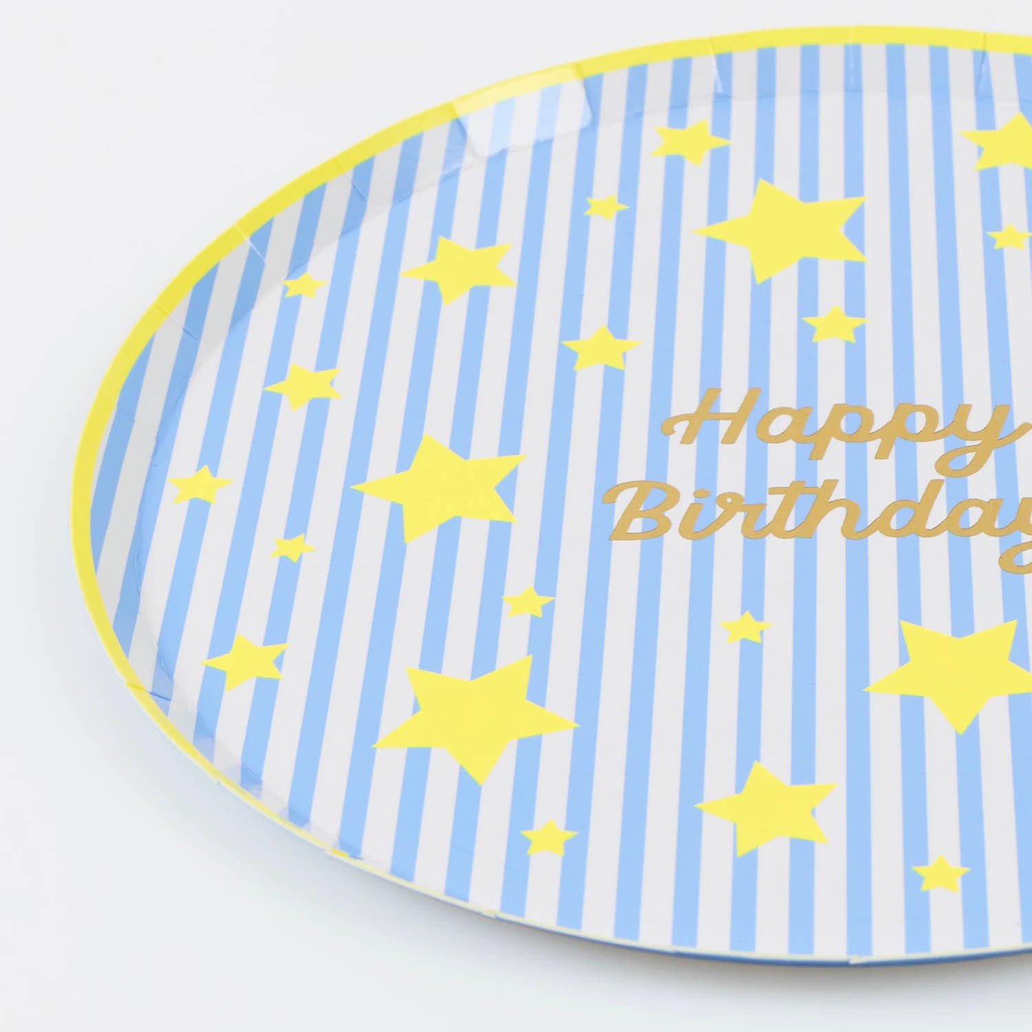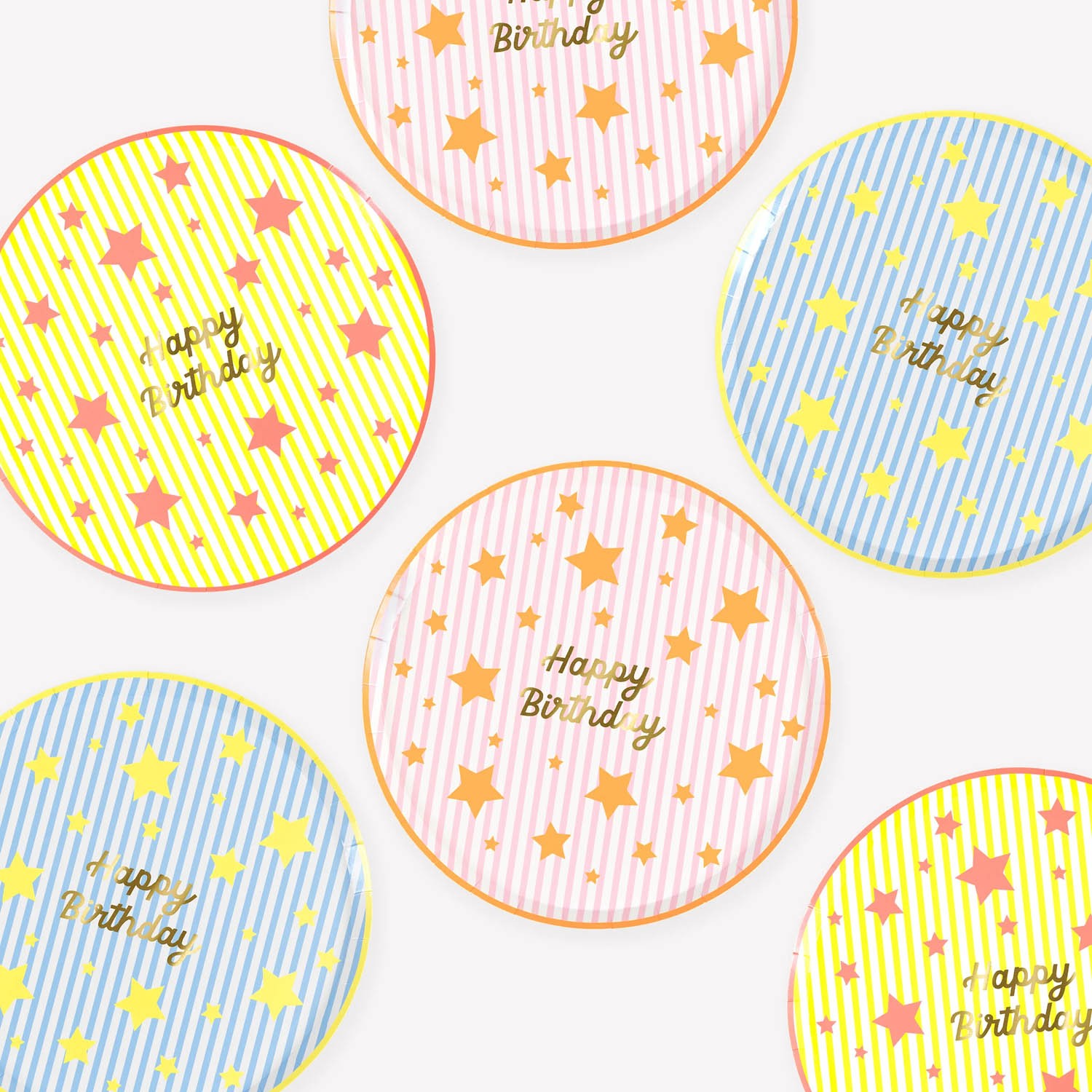 Festeggiate il compleanno di una persona speciale con stile grazie a questi meravigliosi piattini di carta dai colori vivaci. Ognuno presenta al centro la scritta "Buon Compleanno" in oro lucido, circondata da audaci strisce gialle, rosa o blu. Stelle al neon e bordi coordinati aggiungono un tocco finale di allegria. Perfetti per dare un tocco di colore e allegria a qualsiasi festa. Ideali da abbinare ad altre stoviglie.Una confezione da 8 piatti di carta con strisce, stelle al neon e bordi decorati: 2 a strisce gialle, 3 a strisce rosa e 3 a strisce blu. Il piatto a righe gialle ha un bordo e delle stelle rosa neon, con il retro di colore giallo. Il piatto a righe rosa ha un bordo e delle stelle arancione neon, con il retro di colore rosa. I piatti a righe blu hanno un bordo e delle stelle giallo neon, con il retro di colore blu. Messaggio "Buon compleanno" in lamina d'oro brillante al centro.
