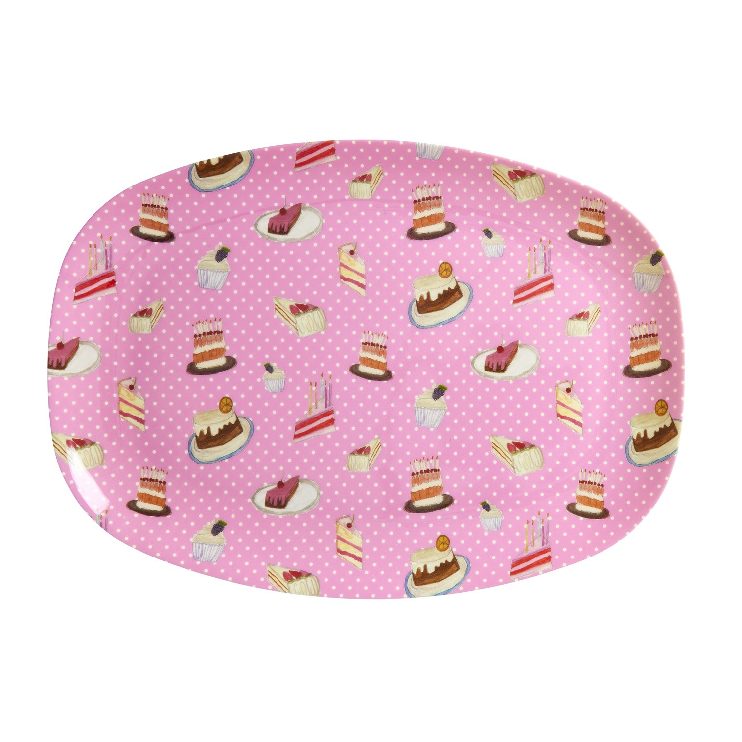 Direttamente dalla nuova collezione Rice, piatto ovale in melamina di colore rosa con fantasia a pois bianchi e torte disegnate all over. Ideale per servire il dolce o la frutta in tavola con quel tocco estivo in più pensando alle vacanze.