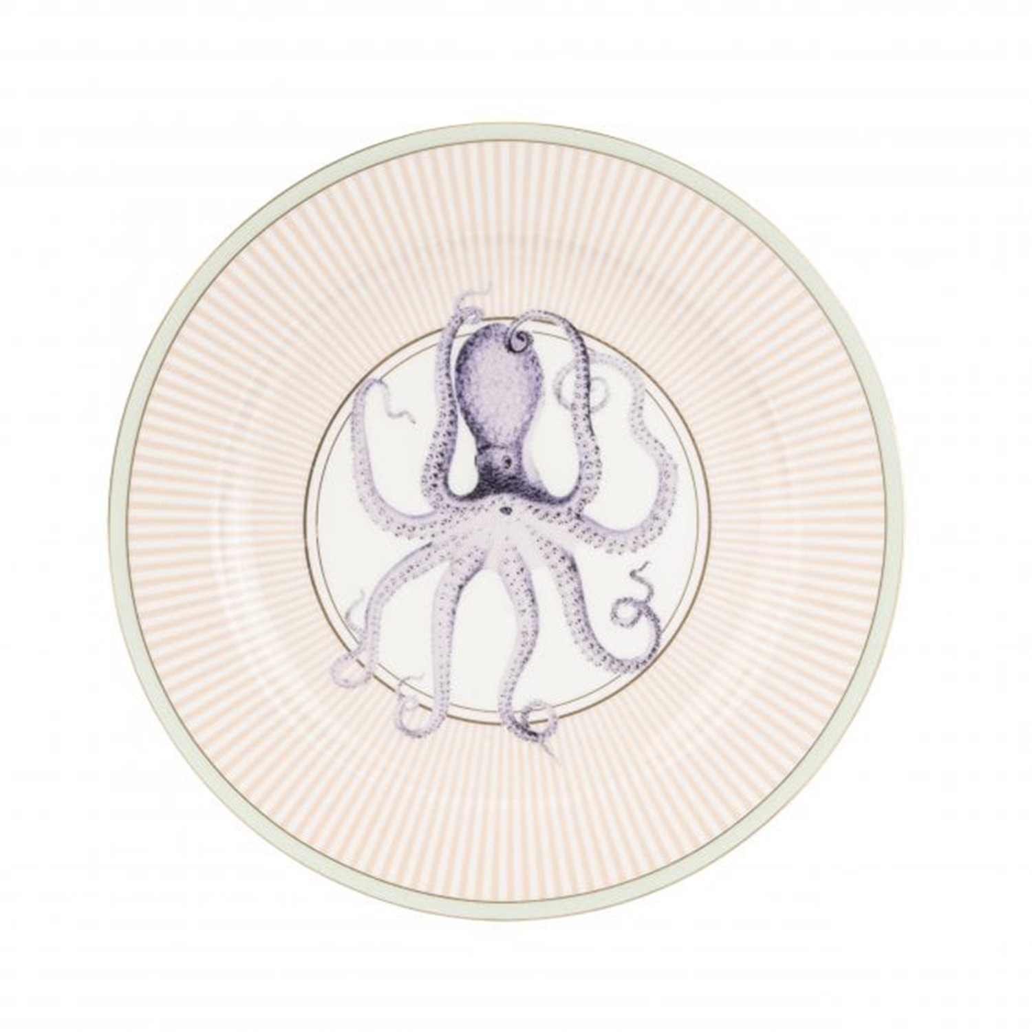 Dalla nuova linea Under The Sea di Yvonne Ellen, piatto piano circolare realizzato in fine porcellana con fantasia a righe arancioni e simpatico polpo disegnato al centro. Perfetto da abbinare agli altri piatti della stessa linea per creare un pendant a tema marino sulla tavola, con tanta voglia di estate. Ideale anche da appendere al muro per un bell’effetto cromatico. Si consiglia il lavaggio a mano, non adatto al microonde.