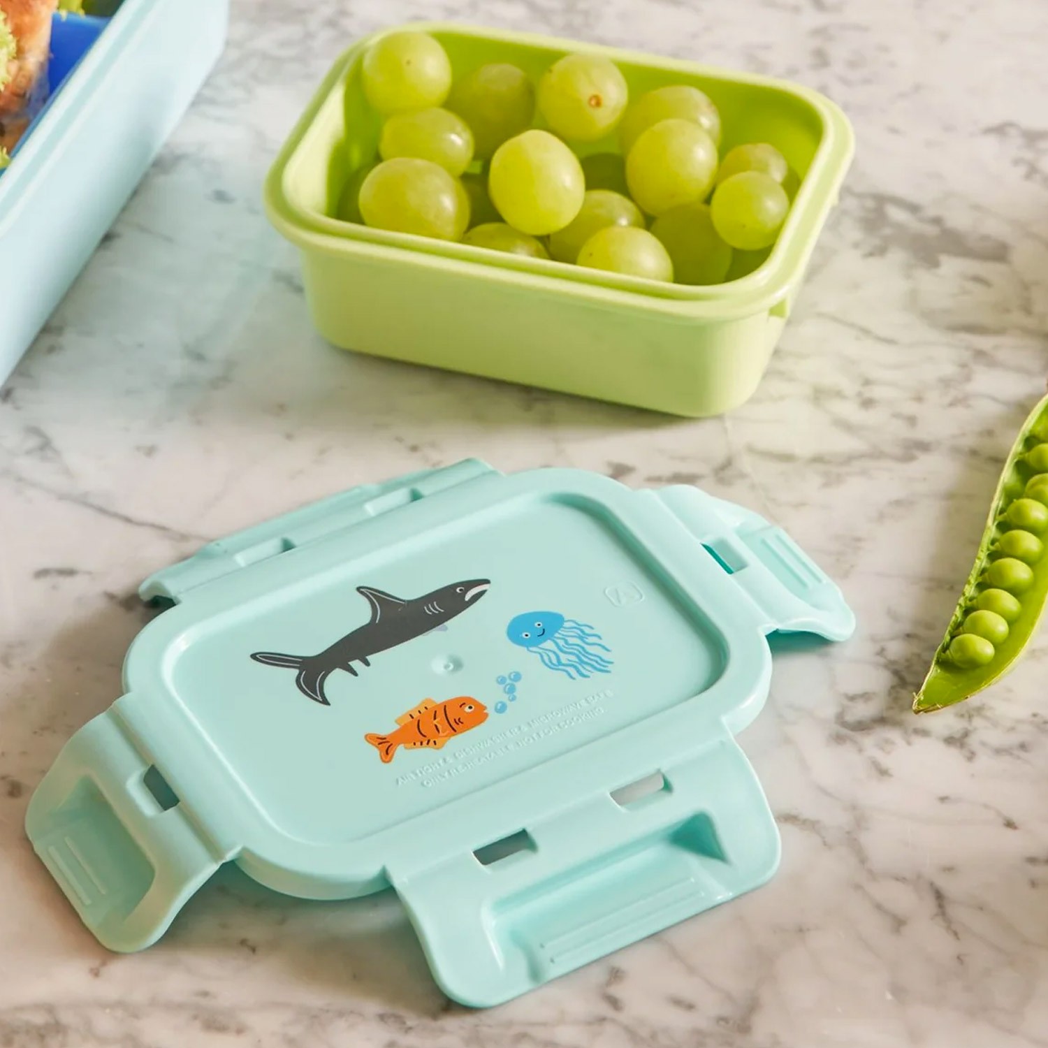 Pratico porta pranzo di forma rettangolare di colore verde pastello con coperchio azzurro chiaro dalla fantasia "Wildlife" a tema animali dell'oceano. Il modo migliore per conservare lo spuntino o la merenda dei bambini.