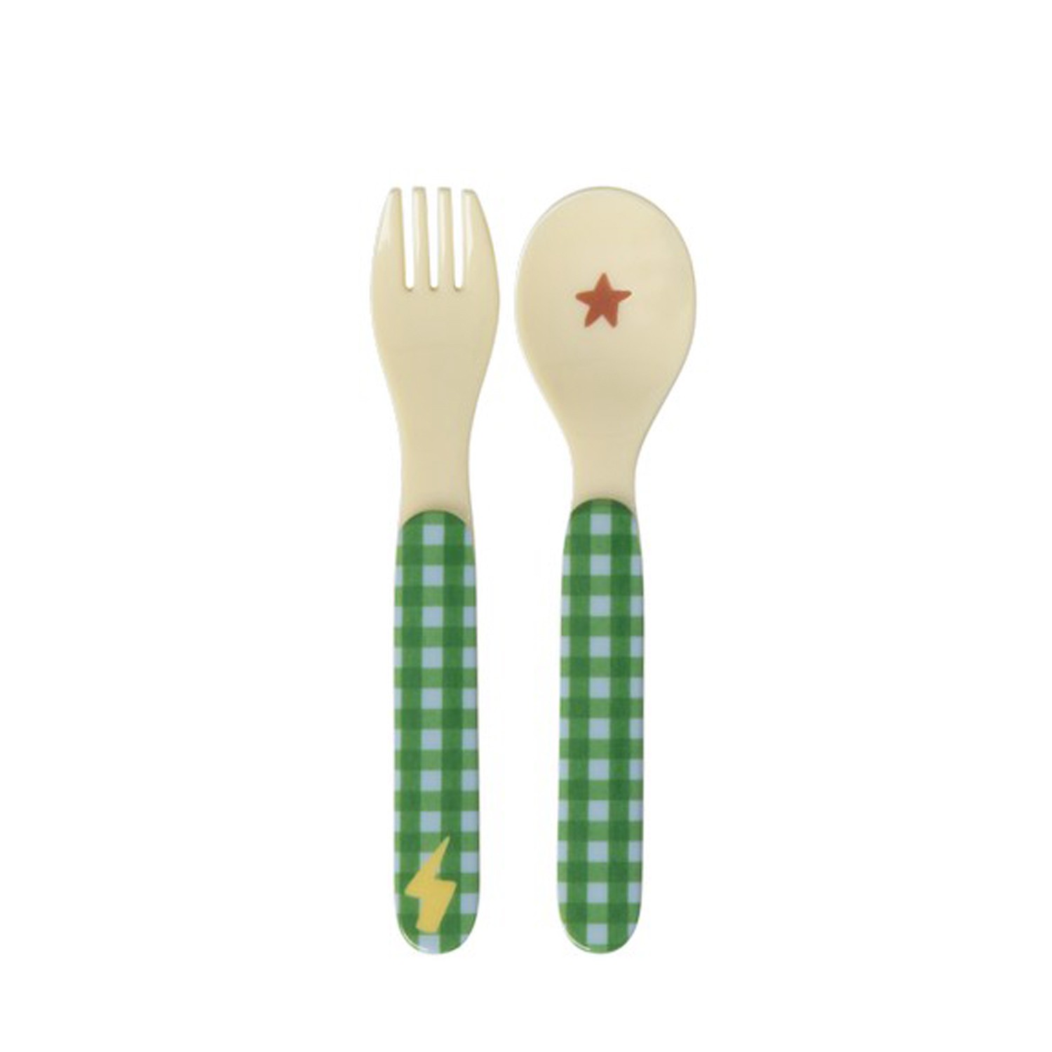Set di posate per bimbi composto da forchetta e cucchiaio in melamina con manico a quadretti verdi e azzurri con fulmine e stellina disegnati.