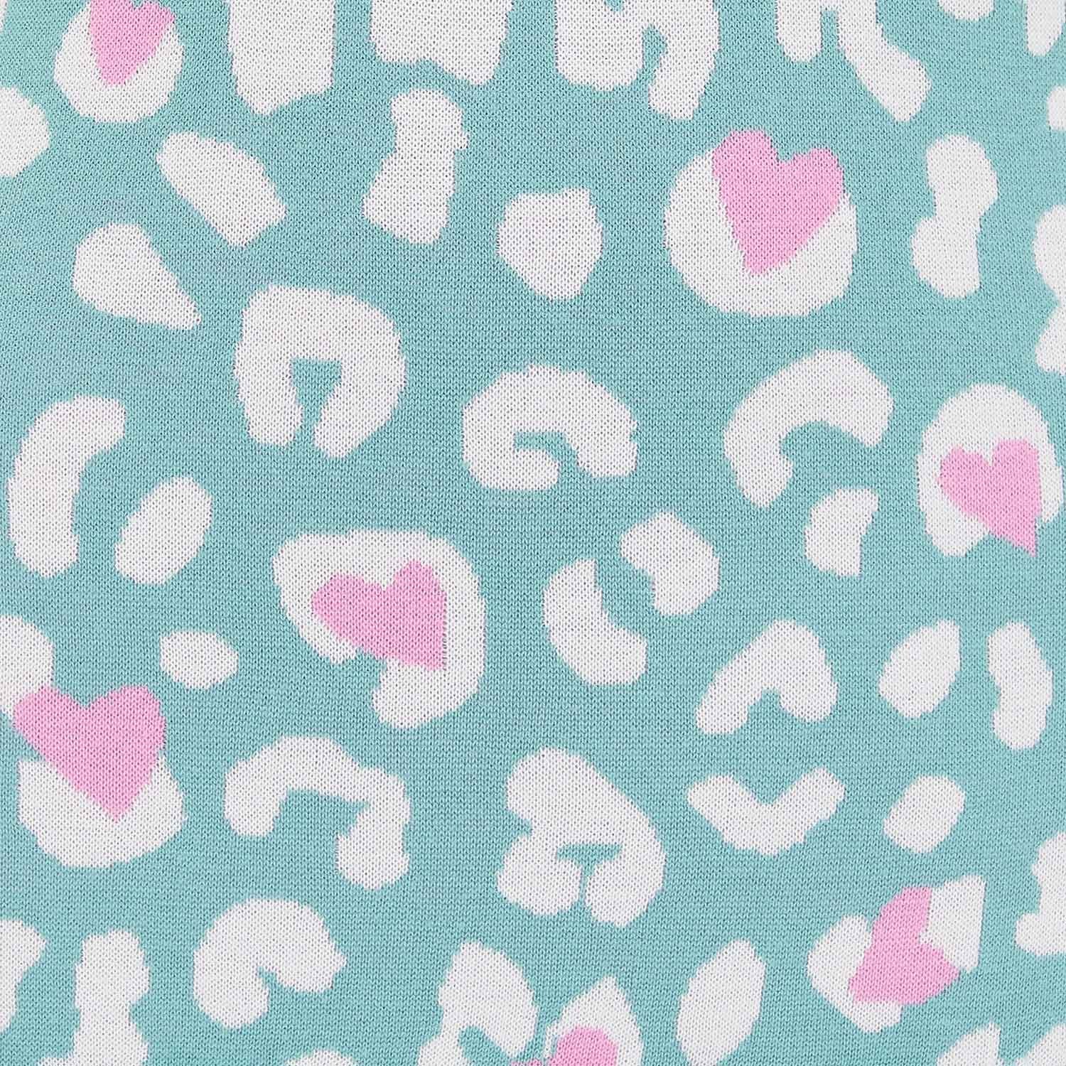 Questo morbido maglione verde acqua con stampa leopardata bianca abbellita da graziosi cuoricini rosa può essere indossato tutto l'anno. Il puro cotone ne assicura longevità e morbidezza, mentre i dettagli classici come polsini, orlo a coste e girocollo lo rendono un capo essenziale del guardaroba.