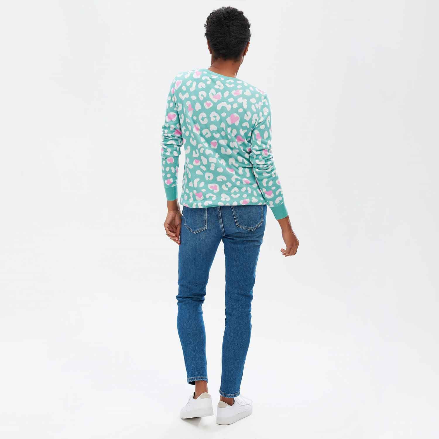 Maglioncino donna verde acqua fantasia leopardata con cuoricini