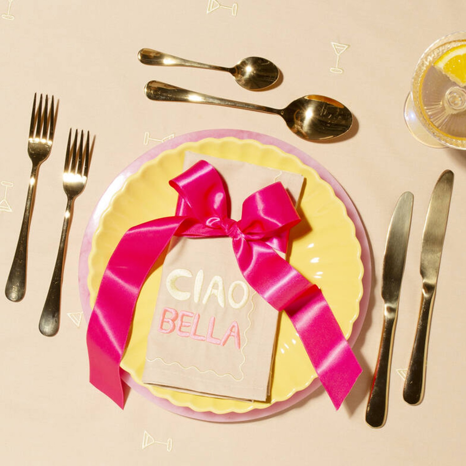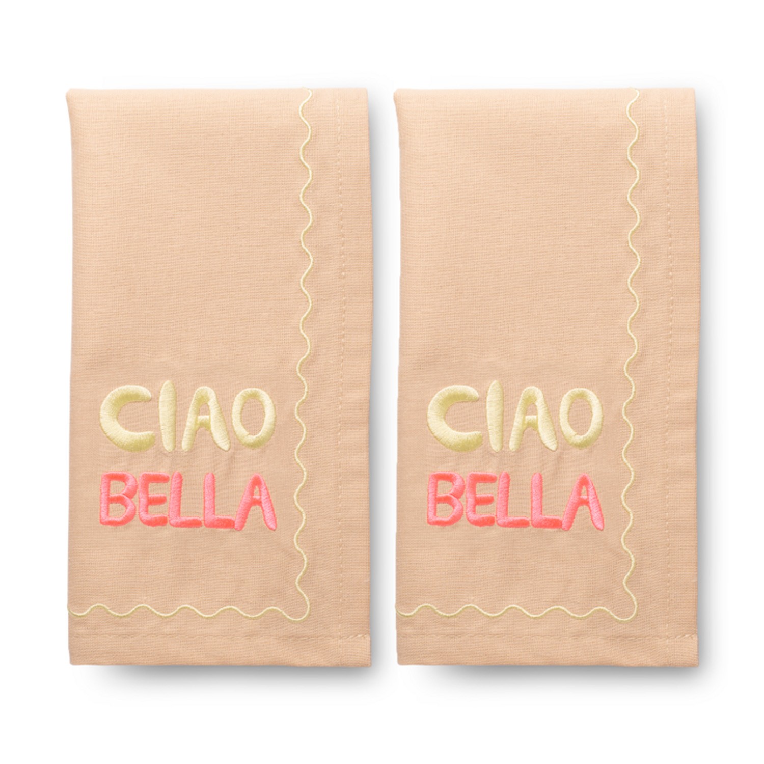 Per stupire la tua dolce metà a tavola in occasioni gioiose, decora la mise-en-place con questi tovaglioli di lusso, un misto di cotone e lino di colore beige, abbelliti dalla scritta CIAO BELLA, che combinano il classico con il contemporaneo. Confezione da 2.
