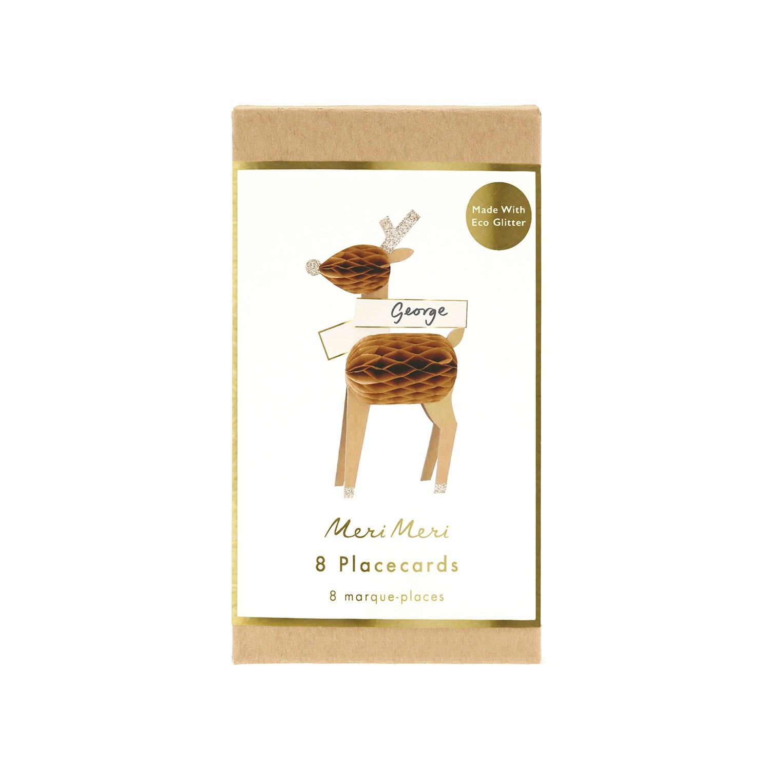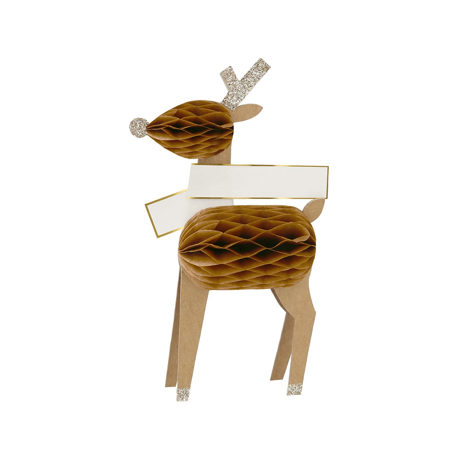 Aiuta i tuoi ospiti a trovare il loro posto a tavola, con questi segnaposto a forma di simpatica renna realizzati in carta FSC sostenibile a nido d'ape con effetto 3D. Una decorazione adorabile che sia i bambini che gli adulti adoreranno. Dettagli glitterati dorati sulle corna e sugli zoccoli. Scrivi i nomi sulle sciarpe di carta dai fini bordi in lamina dorata lucida.