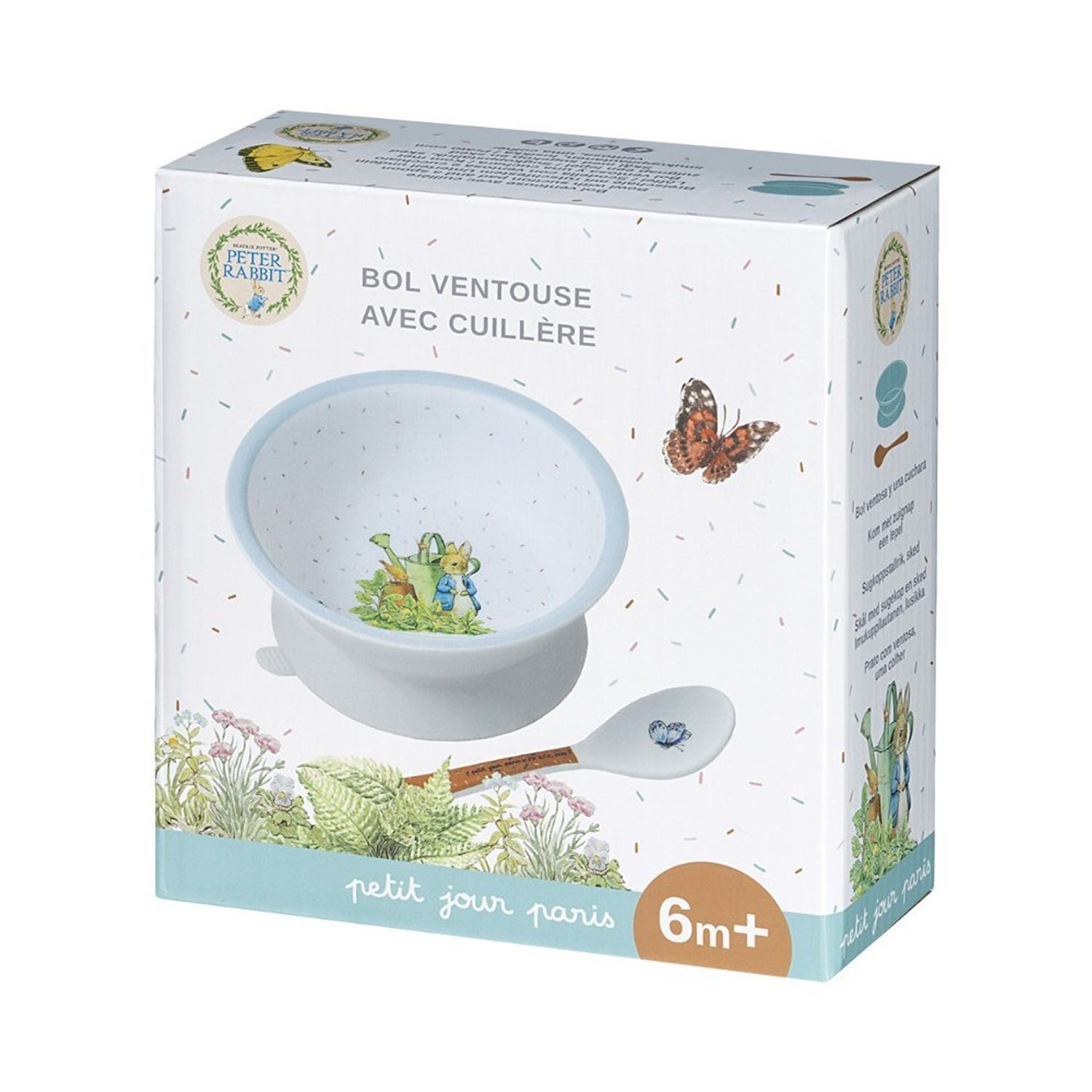 Questo grazioso e simpatico set pappa a tema Peter Rabbit rallegrerà i pasti dei più piccoli in ogni occasione! Grazie alla sua ventosa, il piatto fondo non si muoverà e permetterà al bambino di imparare a mangiare da solo senza rovesciare il contenuto della ciotola! Il cucchiaio, invece, è tutto tondo, sicuro per i più piccini con i loro gesti imprecisi. Set realizzato in melamina.