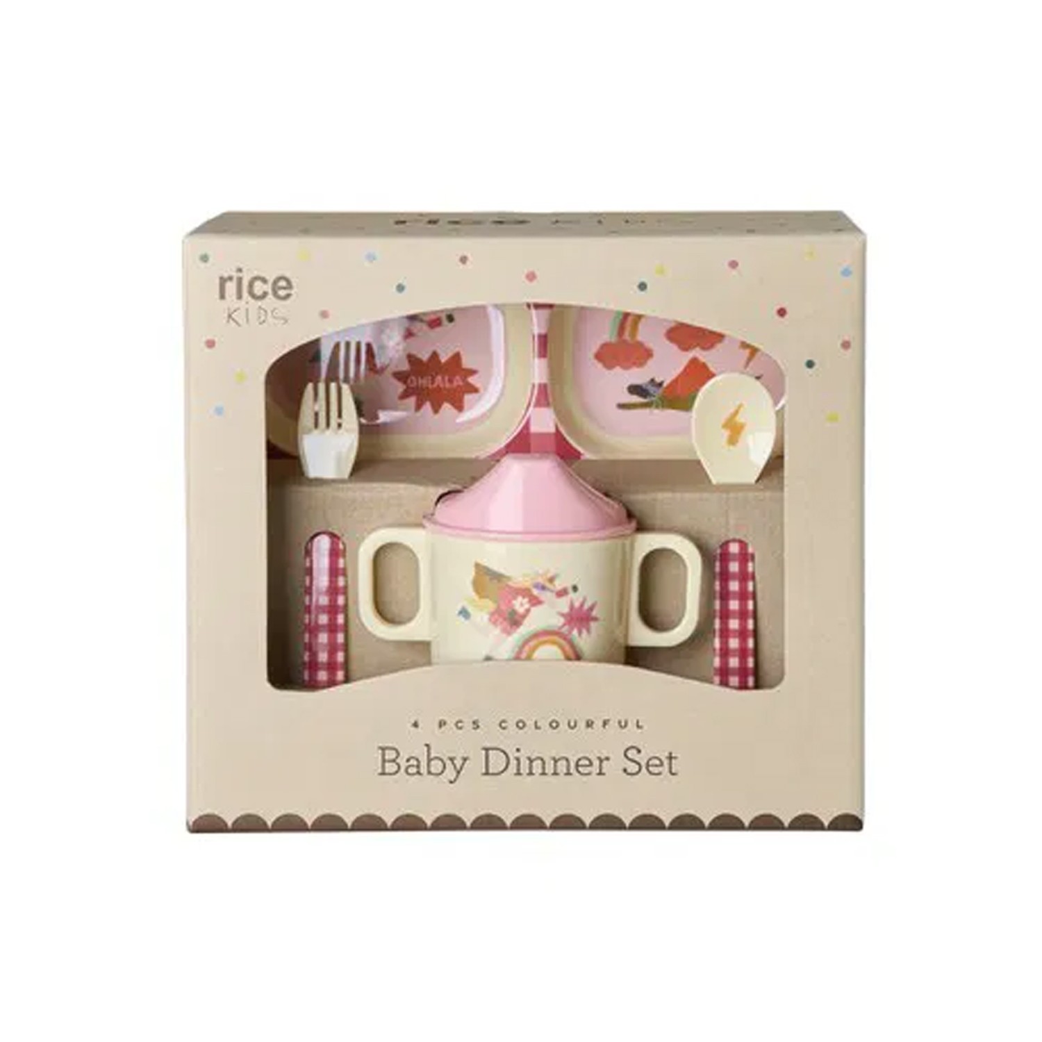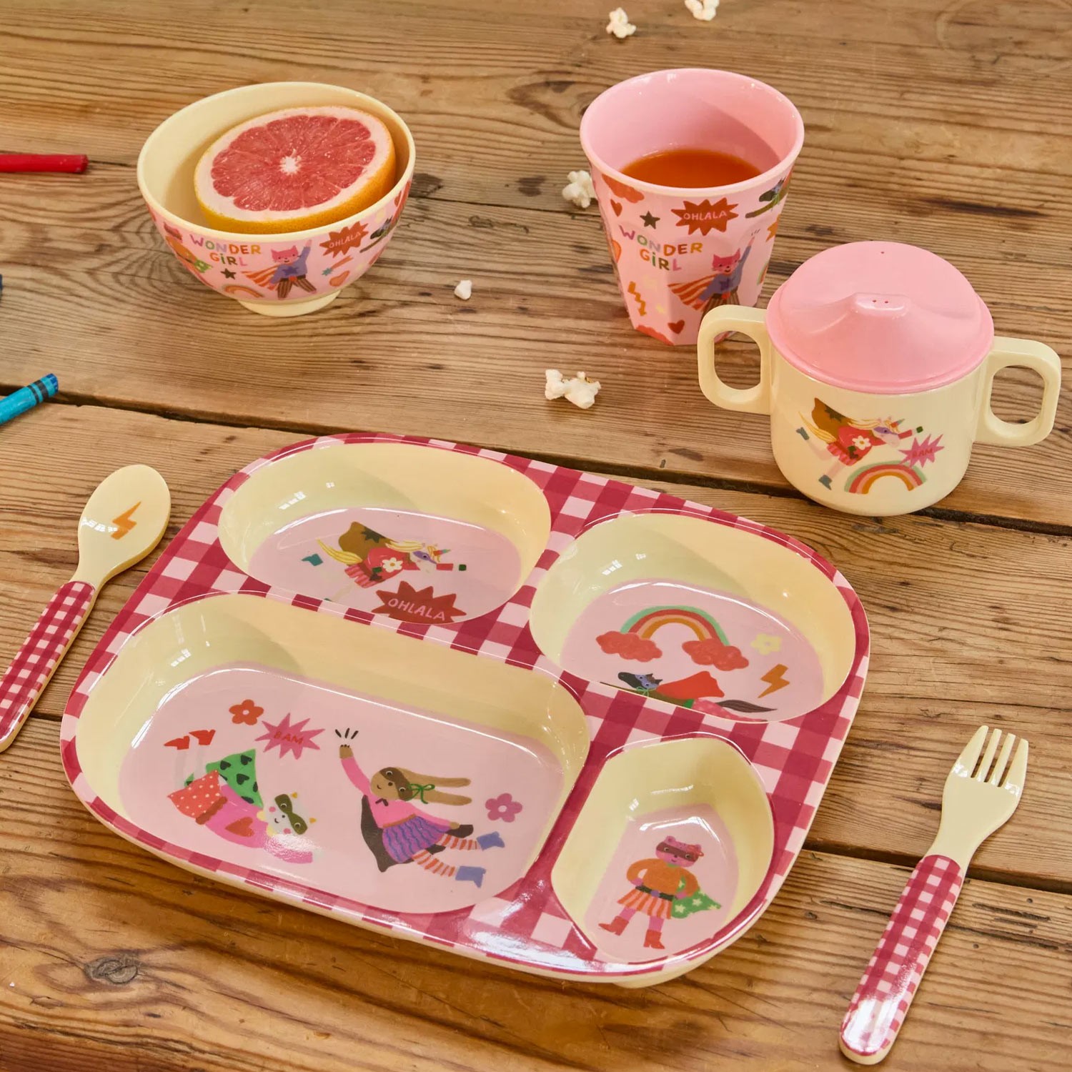 Set realizzato in melamina nelle tonalità del rosa per i più piccoli della famiglia, in una graziosa confezione regalo che contiene i prodotti indispensabili per il loro pranzetto con un'adorabile stampa di animali supereroi su uno sfondo a quadretti rosa: un piatto a 4 scomparti, una tazza con beccuccio e manici, e le posate (cucchiaio e forchetta).