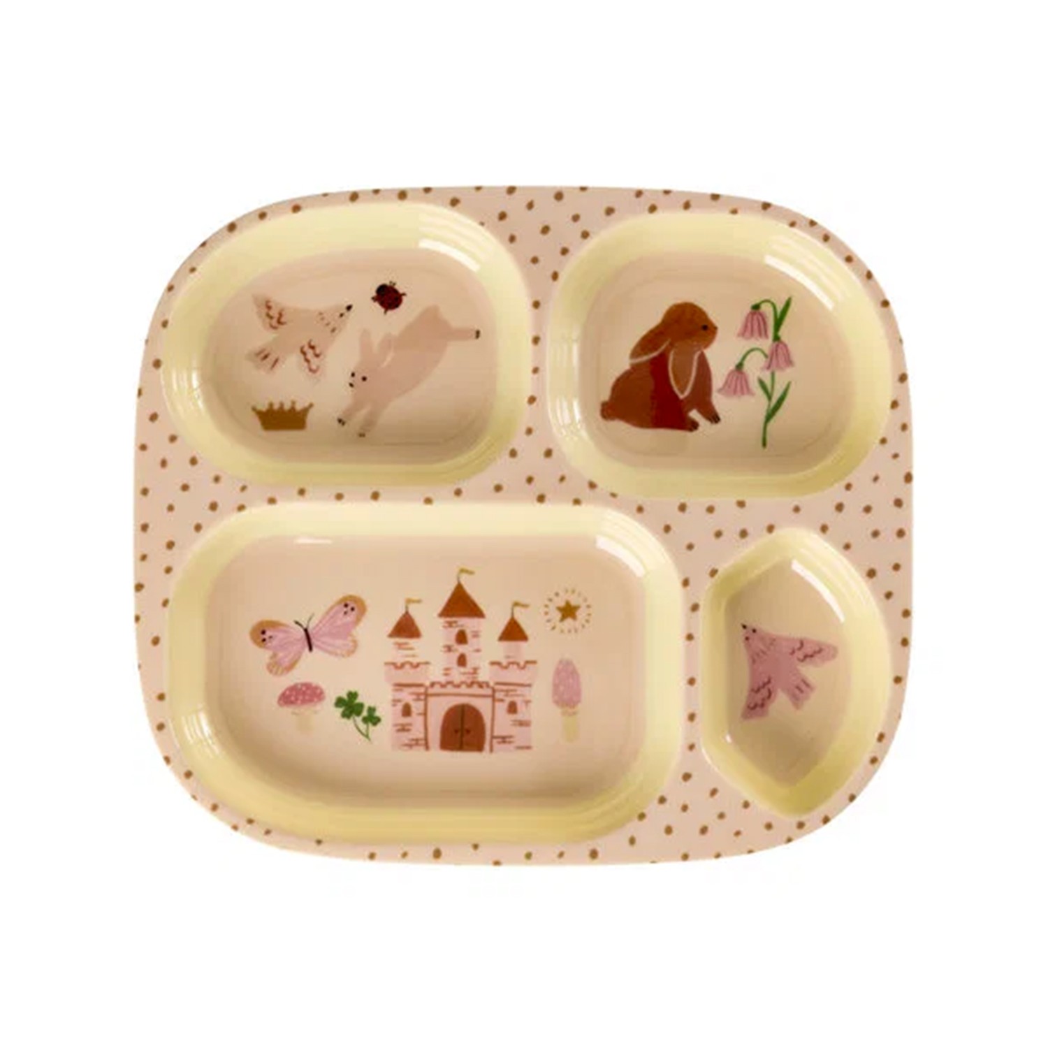 Accendi l'immaginazione dei tuoi piccoli con il set pappa di Rice, una collezione pensata per rendere ogni pasto un momento di gioco, creatività e scoperta. Caratterizzato da stampe colorate a tema fiabesco su sfondo rosa a pois dorati, questo set è l'alleato perfetto per incoraggiare l'autonomia dei bambini a tavola in modo allegro e sicuro. Illustrazioni con simpatici animali e colori dell'arcobaleno che stimolano la fantasia. Include tutto il necessario per i primi pasti: tazza con manici e beccuccio, piatto a 4 scomparti e posate coordinate.