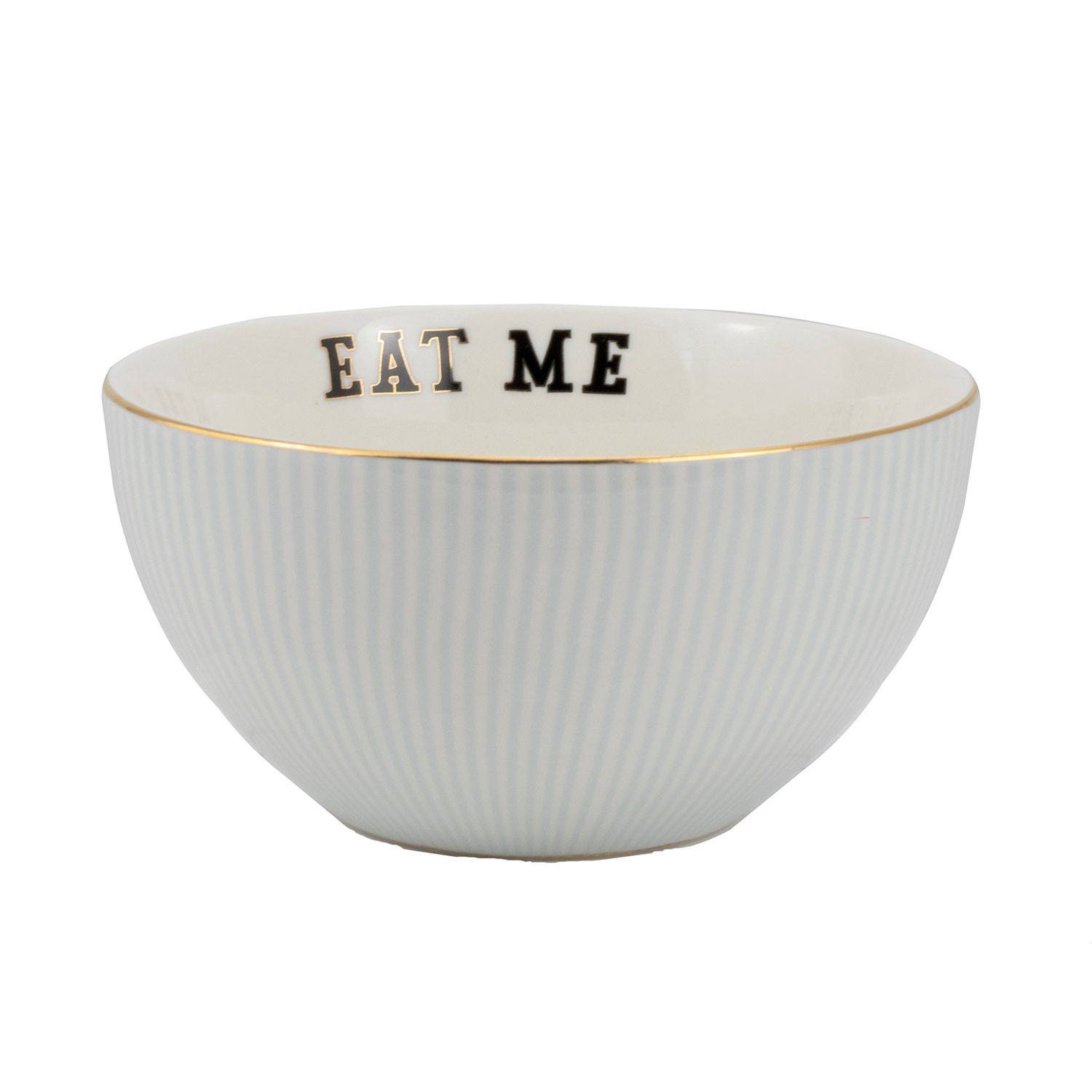 Un piacevole tocco colorato alla tua colazione con questa tazza grande realizzata in pregevole porcellana con interno tinta unita bianca e scritta Eat Me ed esterno con fantasia a righe azzurre e fine bordo dorato. Ideale da abbinare al piatto piano a tema della stessa linea Yvonne Ellen. Si raccomanda il lavaggio a mano.