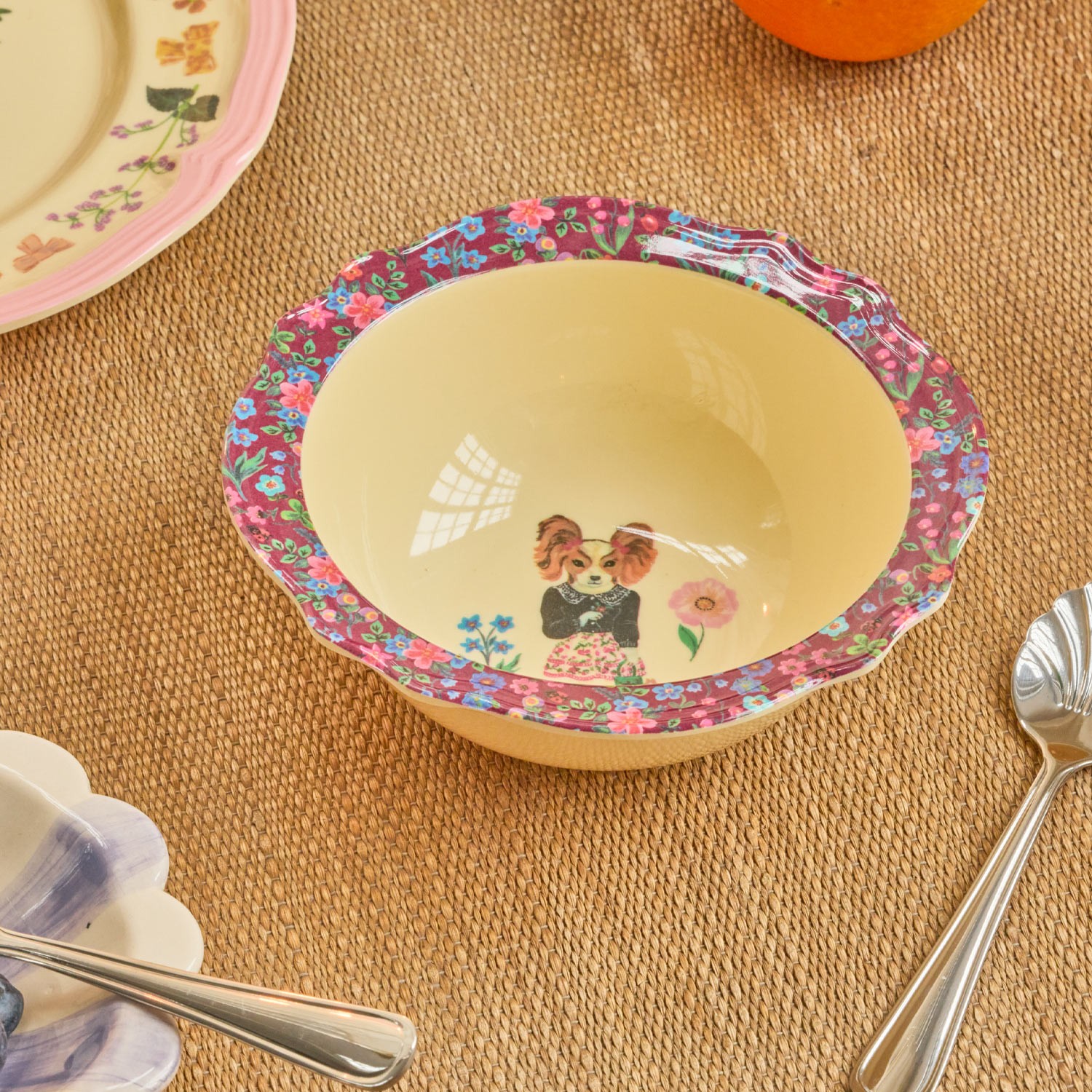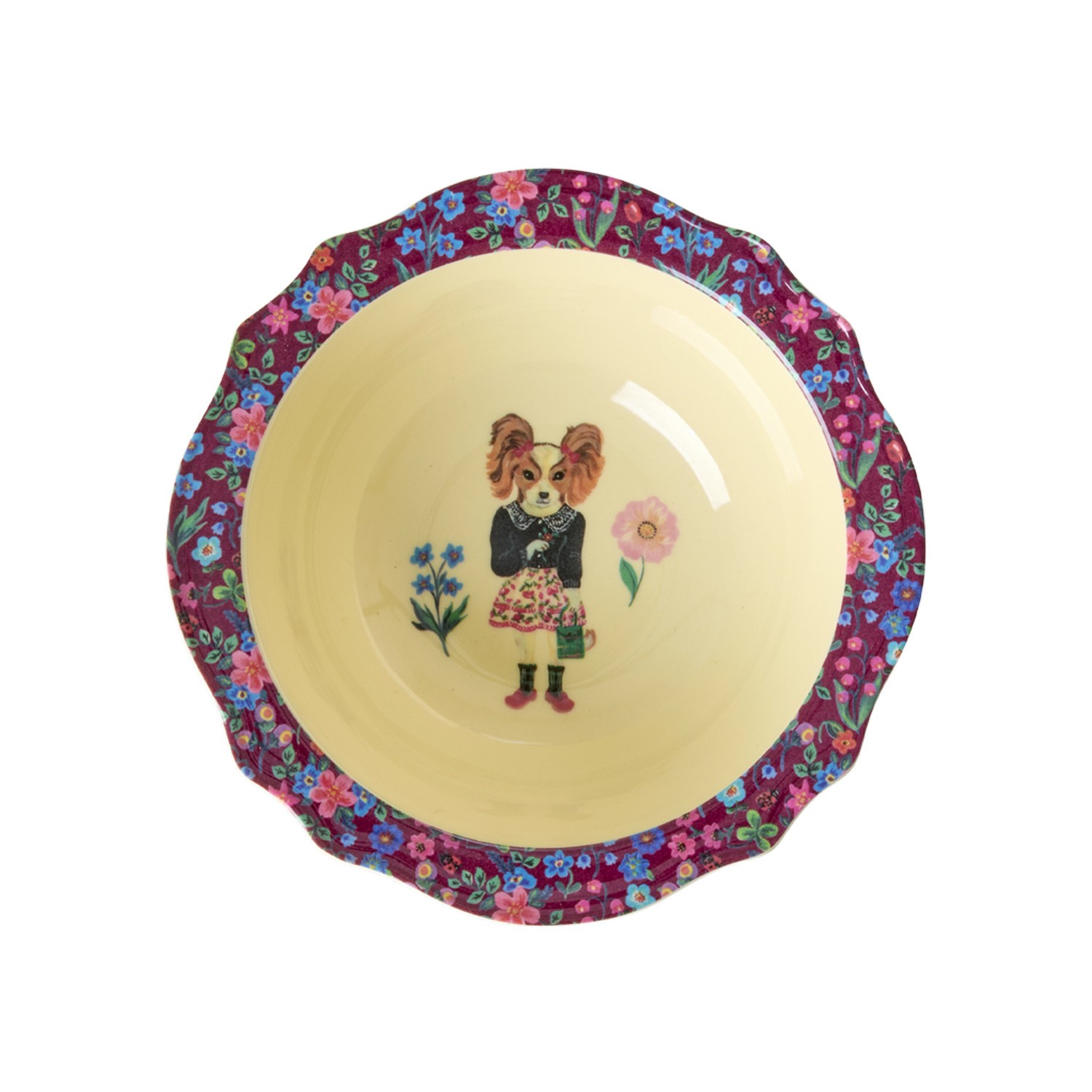 La collaborazione tra Rice e l’artista visiva Nathalie Lete ha dato vita ad una nuova linea, dove si respira quell’aria di giochi d’infanzia e suggestioni vintage. Questa tazza da colazione realizzata in melamina con fine bordo ondulato floreale bordeaux e simpatico cocker disegnato sul fondo, darà un dolce tocco di colore vintage alle colazioni dei più piccoli e non solo.