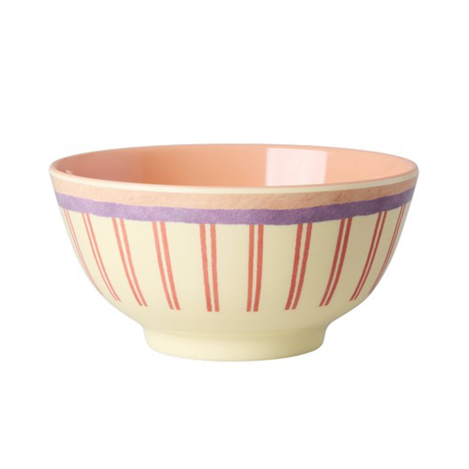 Splendida tazza grande da colazione realizzata in melamina con interno in tinta unita rosa pastello ed esterno color crema con stampa a righe rosse.