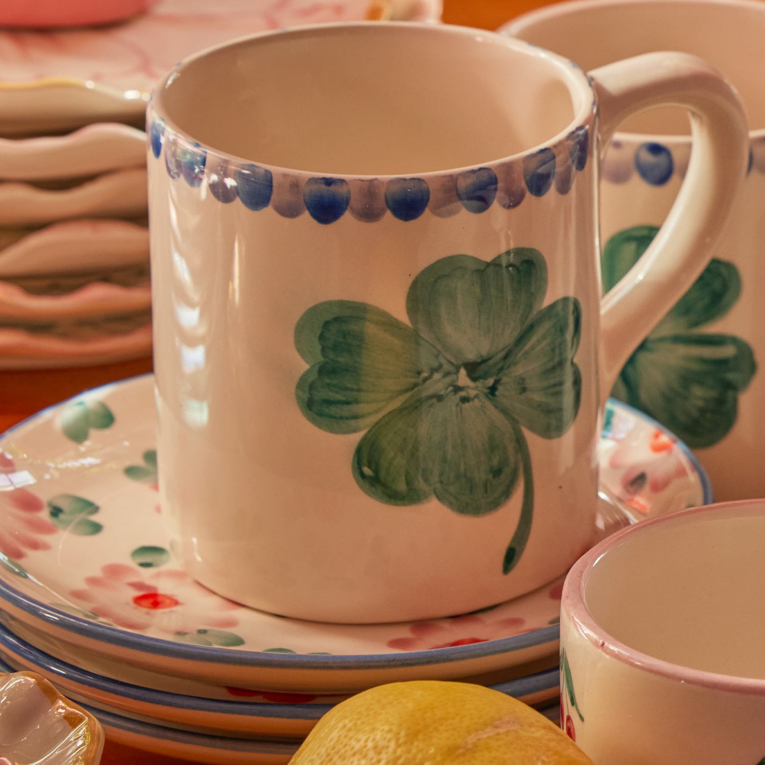 Tazza mug in ceramica di alta qualità con quadrifoglio dipinto a mano e bordo decorato con pennellate. Il design è allegro ed invitante, perfetto per iniziare al meglio la giornata.