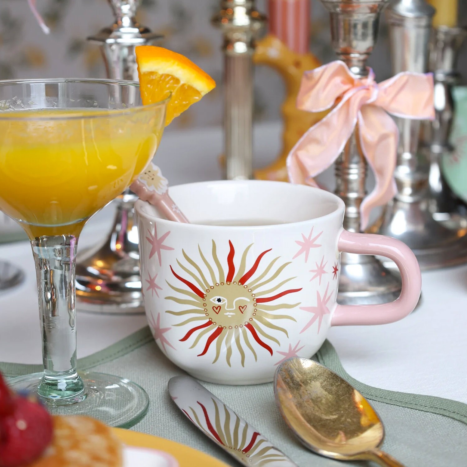 Dai il benvenuto al mattino con un sorriso grazie alla Mug "Sun & Pink Stars". Questa tazza non è solo un contenitore per la tua bevanda preferita, ma un vero e proprio concentrato di energia positiva. Caratterizzata da un design solare e da un manico ergonomico dai toni pastello, è l’accessorio perfetto per rendere speciale ogni pausa caffè o momento dedicato al tè. Al centro spicca l'iconico sole antropomorfo con un’espressione serena e raggi multicolore (rosso, ocra e bruno), che trasmette calore e vitalità. Una pioggia di stelle rosa pastello circonda il sole, donando alla tazza un aspetto sognante e poetico. Il manico ad anello, dalla tonalità rosa cipria, offre una presa comoda e aggiunge un tocco di colore delicato che riprende i decori del corpo. Lo smalto bianco panna interno garantisce la massima igiene e risalta il colore naturale delle tue bevande.