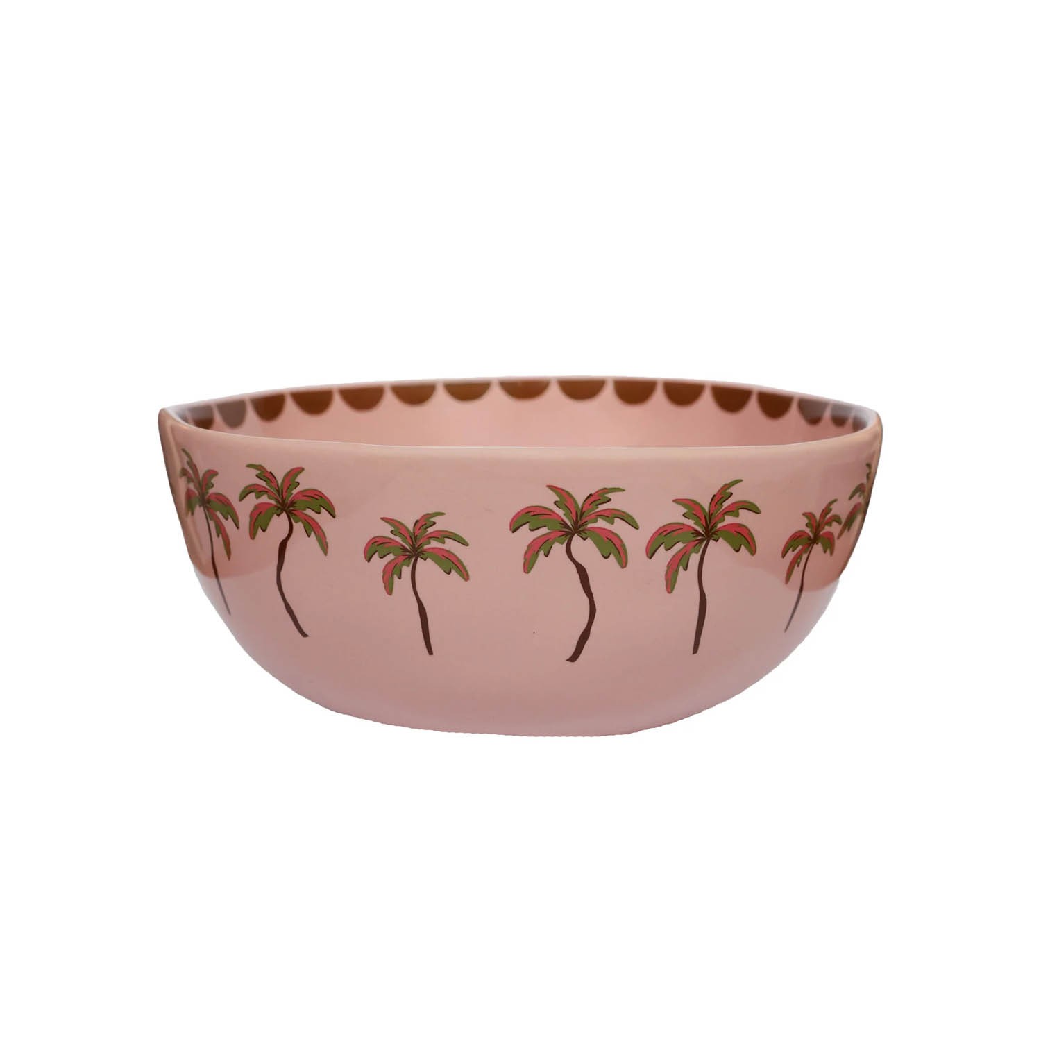 Porta un soffio di calore tropicale nella tua cucina con la ciotola in ceramica "Tropical Sunset". Questo pezzo, che richiama i colori di un tramonto esotico, combina una forma morbida e accogliente con un design illustrativo dal sapore vintage e sognante. Una danza di palme stilizzate dai toni verdi e bruni decora l'esterno della ciotola, creando un ritmo visivo continuo e armonioso. Il profilo superiore interno è rifinito con un motivo a semicerchi color terracotta, un dettaglio discreto che aggiunge profondità al design. Il rosa cipria della base è delicato e moderno, perfetto per far risaltare il colore delle tue pietanze o per integrarsi in un arredamento dai toni naturali.