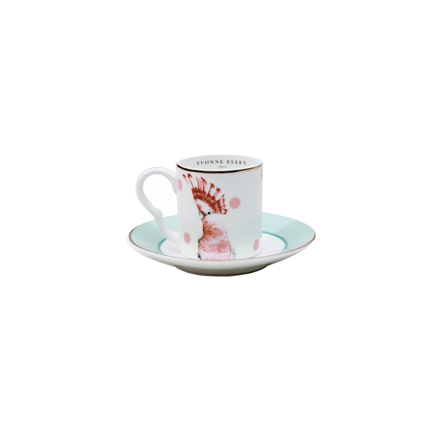 Grazioso servizio da caffè in porcellana formato da un piattino azzurro pastello e da una tazzina bianca con fantasia a pois rosa e simpatico pappagallo, decorata da un fine bordo dorato.