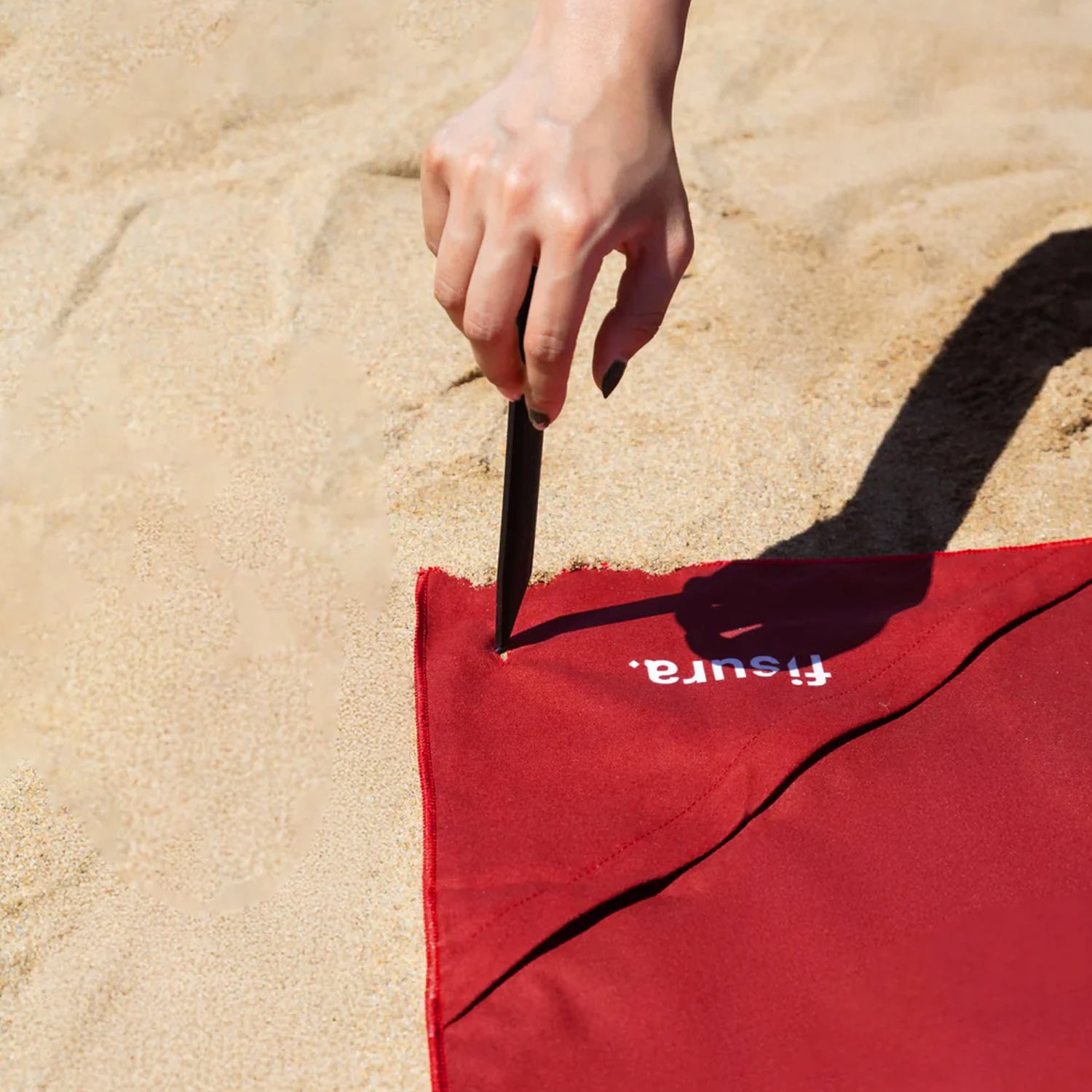 Il telo misura 180 cm x 100 cm ed è disponibile in una comoda custodia. Include anche quattro picchetti per fissarlo alla sabbia ed evitare che voli via, ma se sei una di quelle persone che non può vivere senza una sedia a sdraio...non preoccuparti! È dotato anche di un elastico per fissarlo facilmente ed evitare che scivoli via.