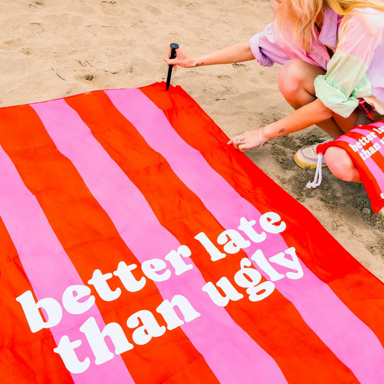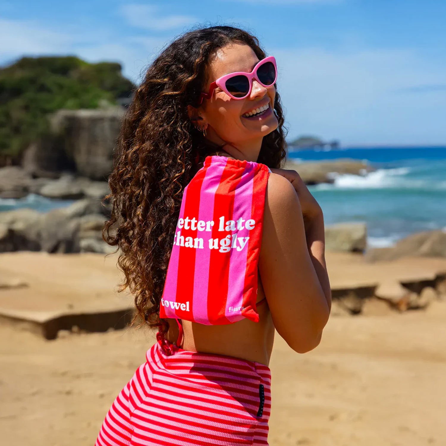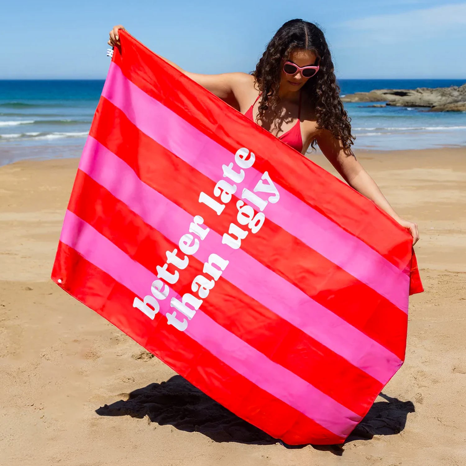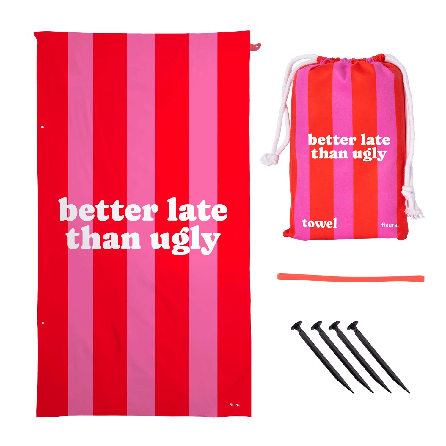 Con la scritta "Better Late than Ugly" su questo telo da spiaggia a righe rosse e fucsia, sarà chiaro che preferisci arrivare tardi ma con un'abbronzatura fantastica. Essendo in microfibra, è un telo leggero, ad asciugatura rapida e anti-sabbia, così puoi goderti il sole senza che quella dannata sabbia ti si attacchi.