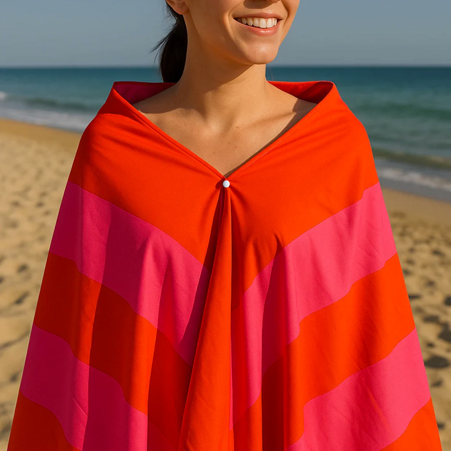 Se ami avvolgerti in un asciugamano dopo un tuffo rinfrescante, ora puoi farlo senza usare le mani! Grazie ai suoi due bottoni automatici, questo esclusivo telo mare si trasforma in un mantello che ti protegge mentre prendi il sole o ti godi il tuo drink preferito. E tutto a mani libere!