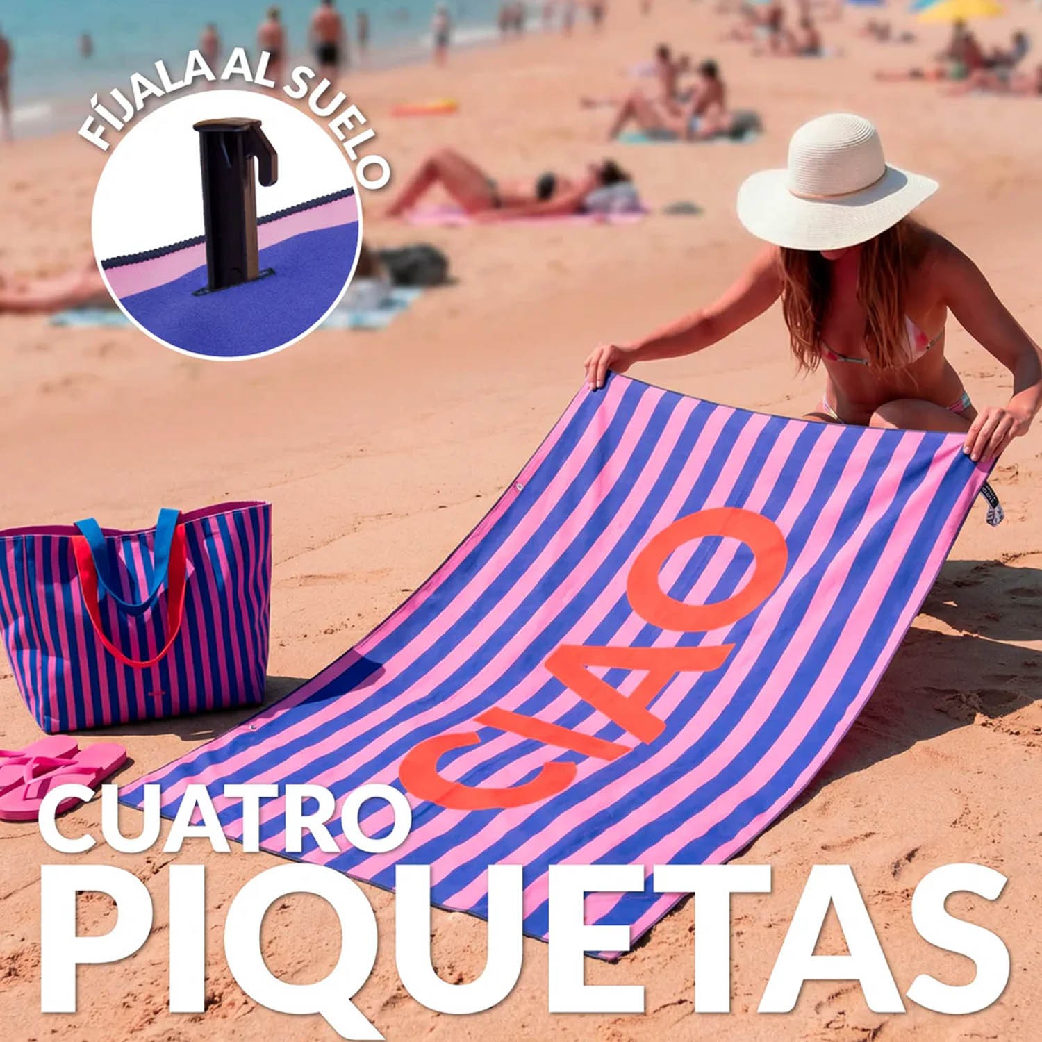 Il telo misura 180 cm x 100 cm ed è disponibile in una comoda custodia. Include anche quattro picchetti per fissarlo alla sabbia ed evitare che voli via, ma se sei una di quelle persone che non può vivere senza una sedia a sdraio...non preoccuparti! È dotato anche di un elastico per fissarlo facilmente ed evitare che scivoli via.