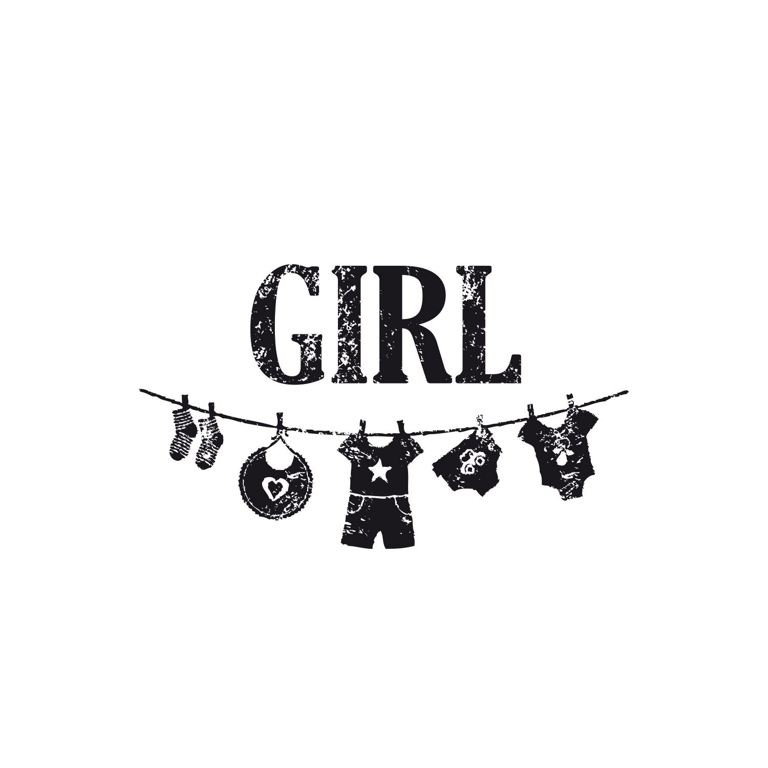 Timbro dalle sfumature vintage in bianco e nero con la scritta "GIRL" e dettagli disegnati appesi ad un filo, una simpatica idea regalo per un'amica.