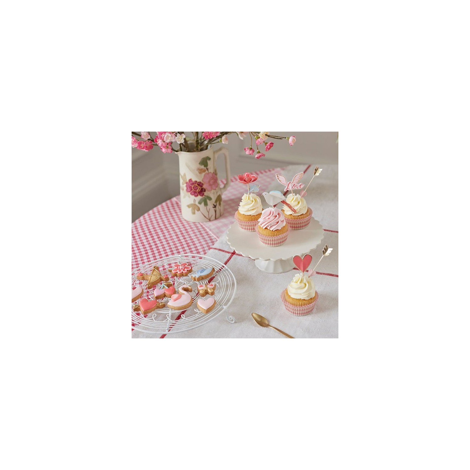 Questo grazioso kit per cupcakes sarà perfetto per sfornare gustosi dolcetti a San Valentino…la tua dolce metà rimarrà a bocca aperta! Nella confezione troverai un set formato da 24 toppers in 5 diversi design a tema (tra cui cuori, fiori ed uccellini) e 24 pirottini di carta con fantasia a righe ondulate rosa e beige.