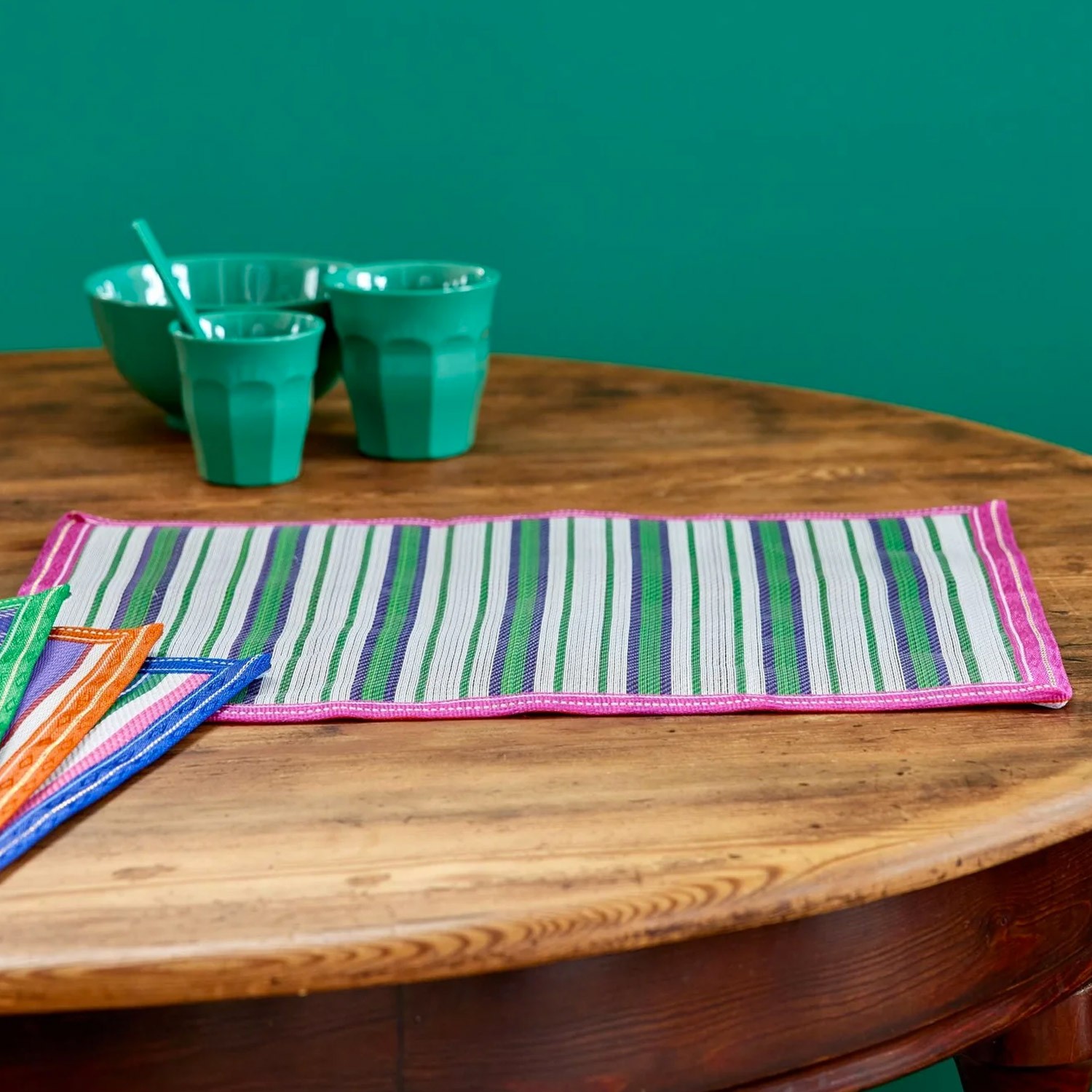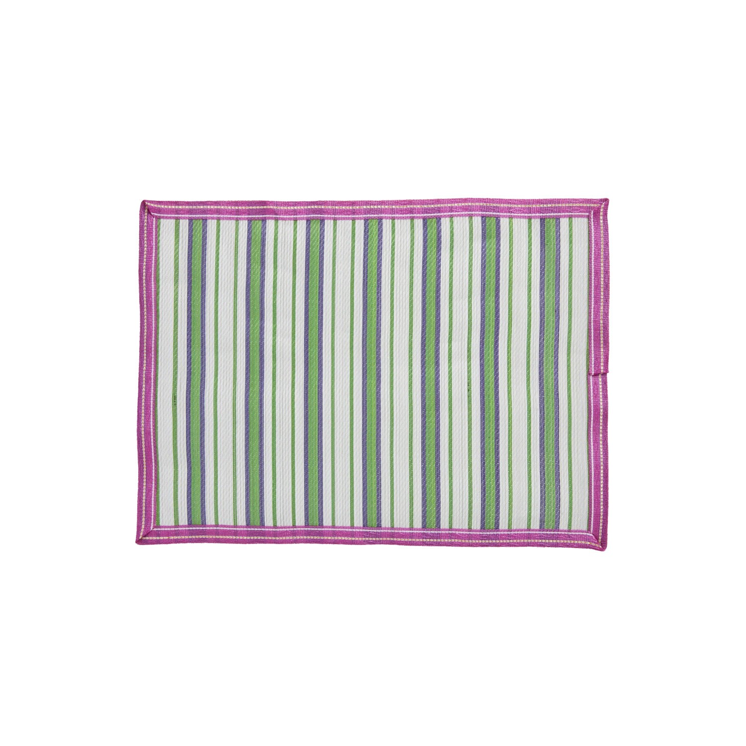 Aggiungi un tocco di colore alla tua tavola con questa tovaglietta in plastica riciclata con fantasia a righe verdi e viola incorniciate da un vivace bordo fucsia. Che si tratti di una cena in famiglia o di un pasto da soli, l'allegria sarà di casa!