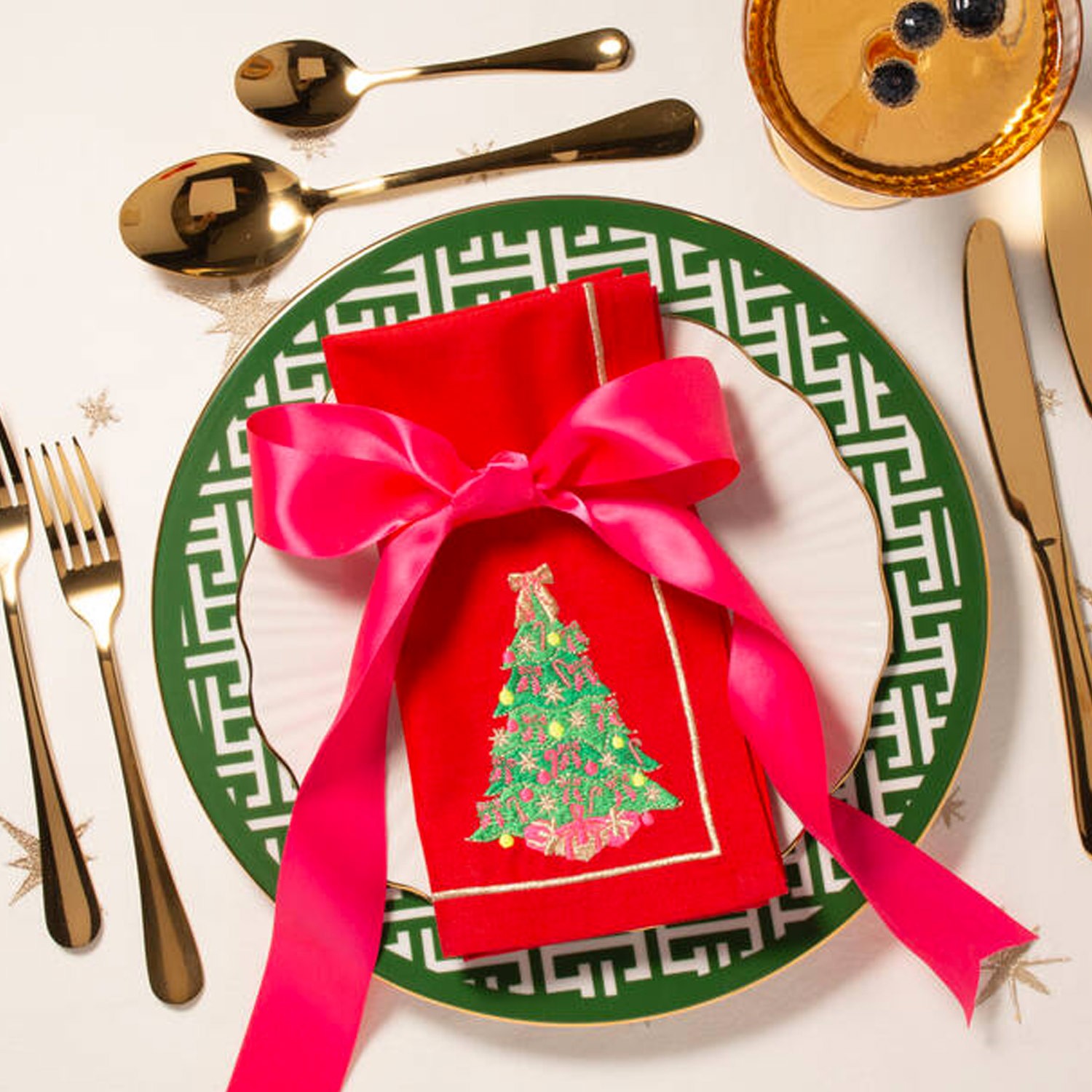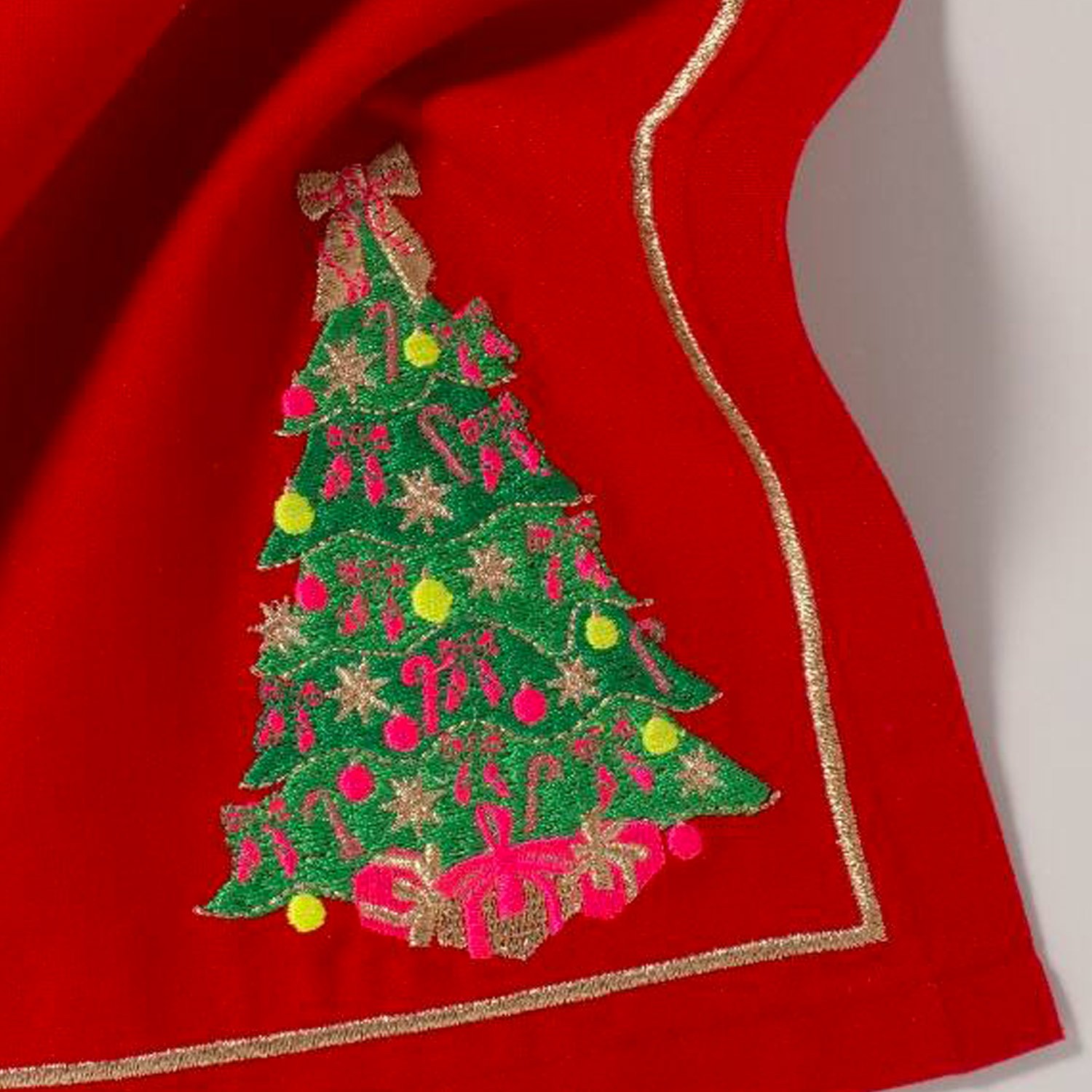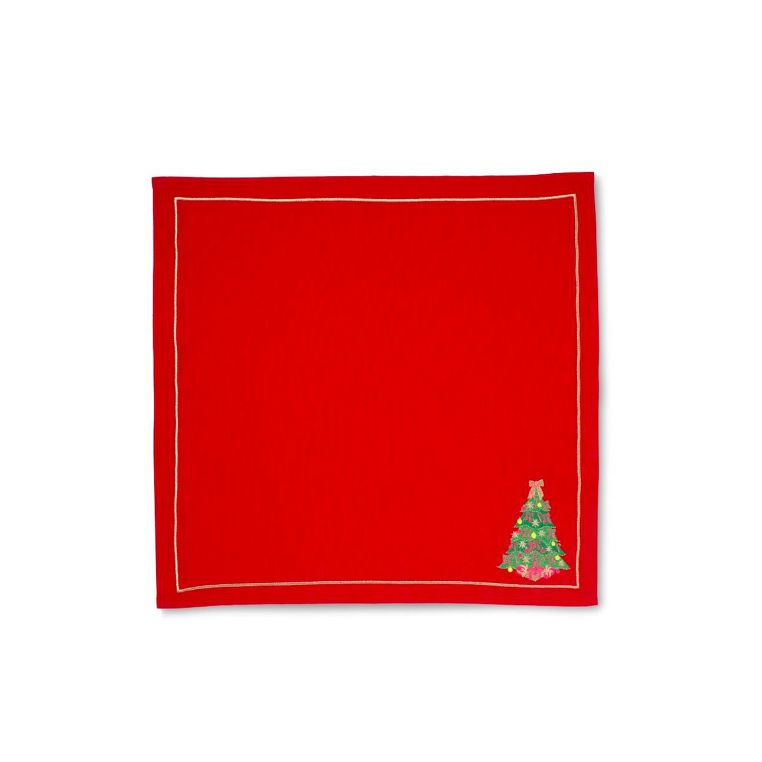 Per stupire tutti a tavola in occasioni importanti, in particolar modo a Natale, decora la tua mise-en-place con questi tovaglioli di lusso, un misto di cotone e lino di colore rosso, abbelliti da un pregevole ricamo a forma di albero natalizio in un angolo e da una fine bordatura dorata, che combinano il classico con il contemporaneo. Confezione da 2.
