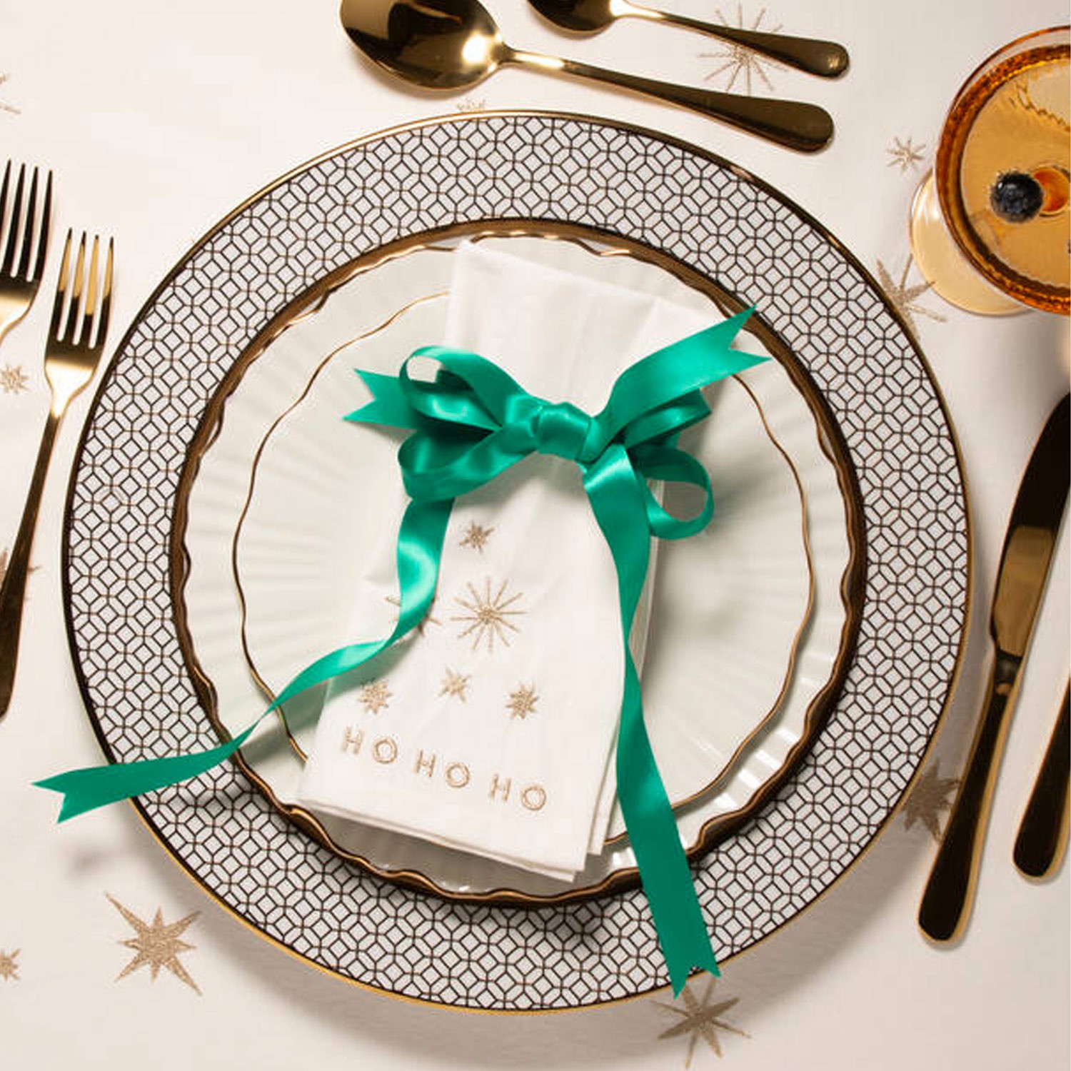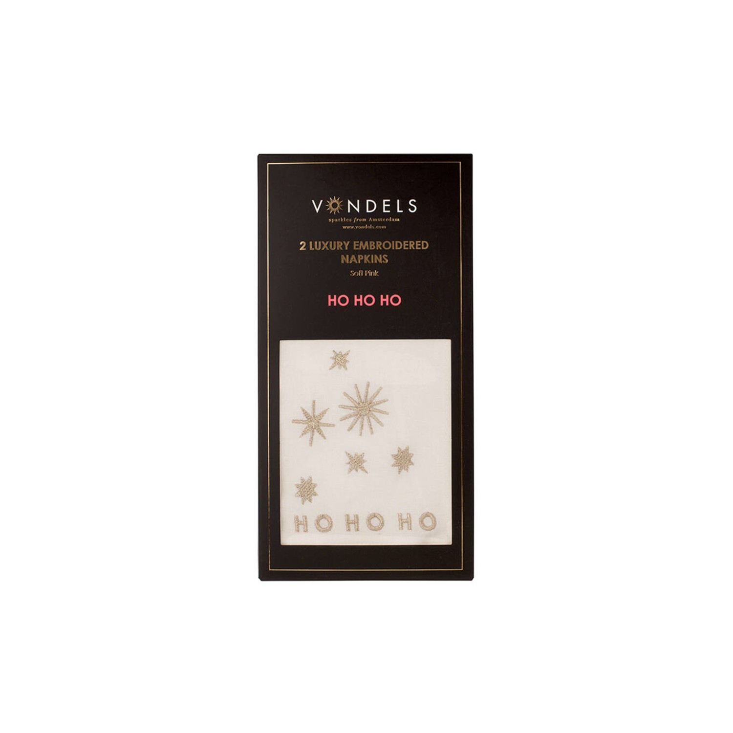Per stupire tutti a tavola in occasioni importanti, in particolar modo a Natale o per Capodanno, decora la tua mise-en-place con questi tovaglioli di lusso, un misto di cotone e lino di colore beige, abbelliti da un pregevole ricamo a tema con stelline e la scritta dorata HO HO HO, che combinano il classico con il contemporaneo. Confezione da 2.