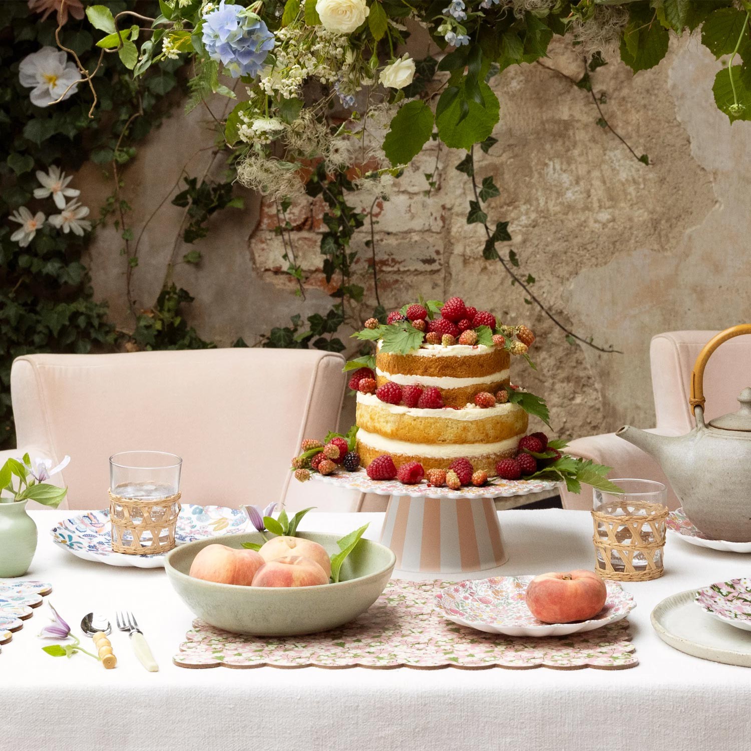 Frutto della collaborazione tra Meri Meri con Liberty, questa tovaglietta americana dal grande impatto impreziosirà ogni occasione a tavola. La stampa floreale Liberty su sfondo rosa è abbinata a un bordo smerlato per un look elegante. Questa tovaglietta è realizzata in legno composito con supporto in sughero, per garantire resistenza senza compromettere lo stile. Ideale per cene o per l'uso quotidiano, per aggiungere raffinatezza alla vostra tavola.