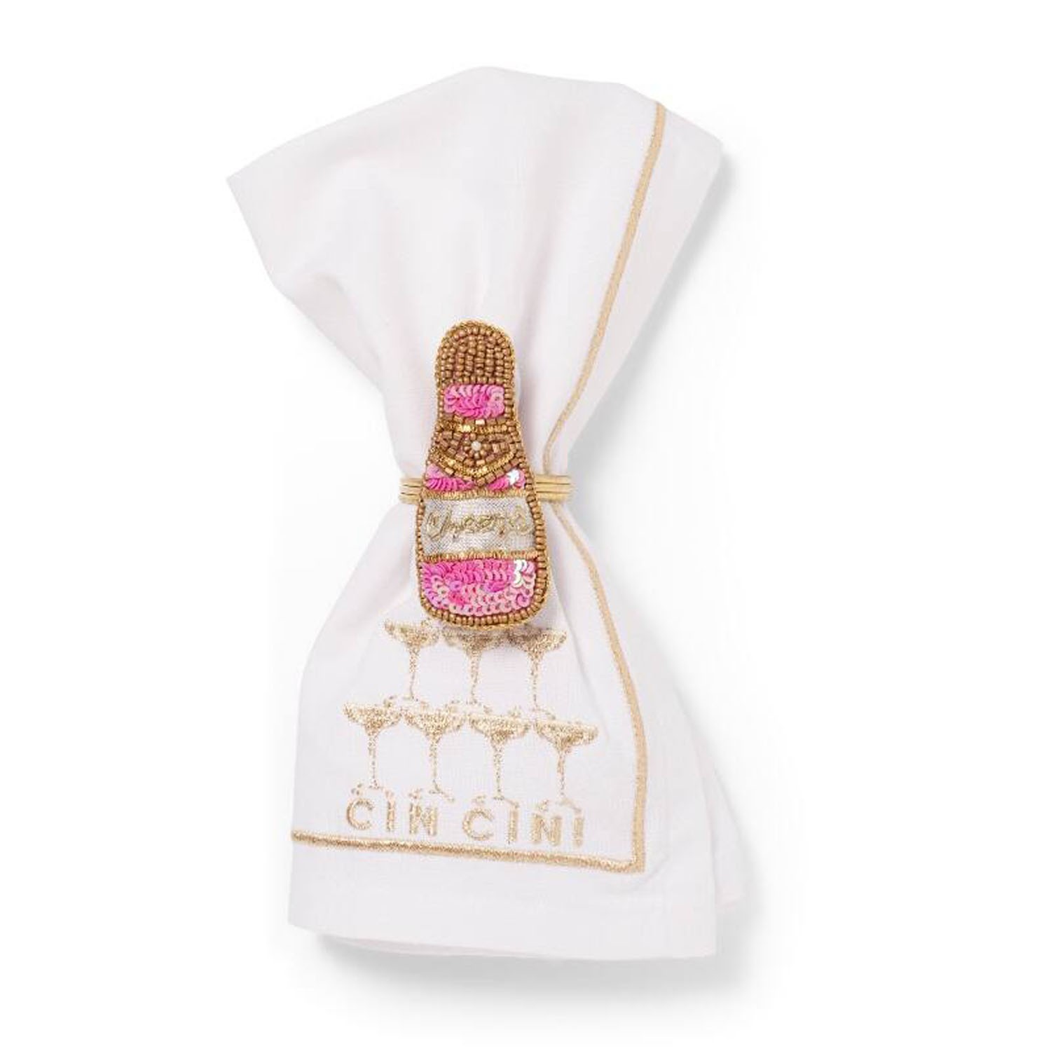 Non è un semplice portatovagliolo, è un piccolo pezzo di haute couture per la tua tavola: la bottiglia è interamente decorata a mano con un mix di paillettes rosa e micro-perline dorate, che creano un effetto tridimensionale e catturano la luce con ogni movimento. L'etichetta presenta la scritta "Cheers" ricamata in filato bianco, aggiungendo un tocco di autenticità. La base, invece, è composta da anelli dorati multipli che garantiscono una tenuta stabile ed elegante al tovagliolo, aggiungendo un effetto gioiello al set.