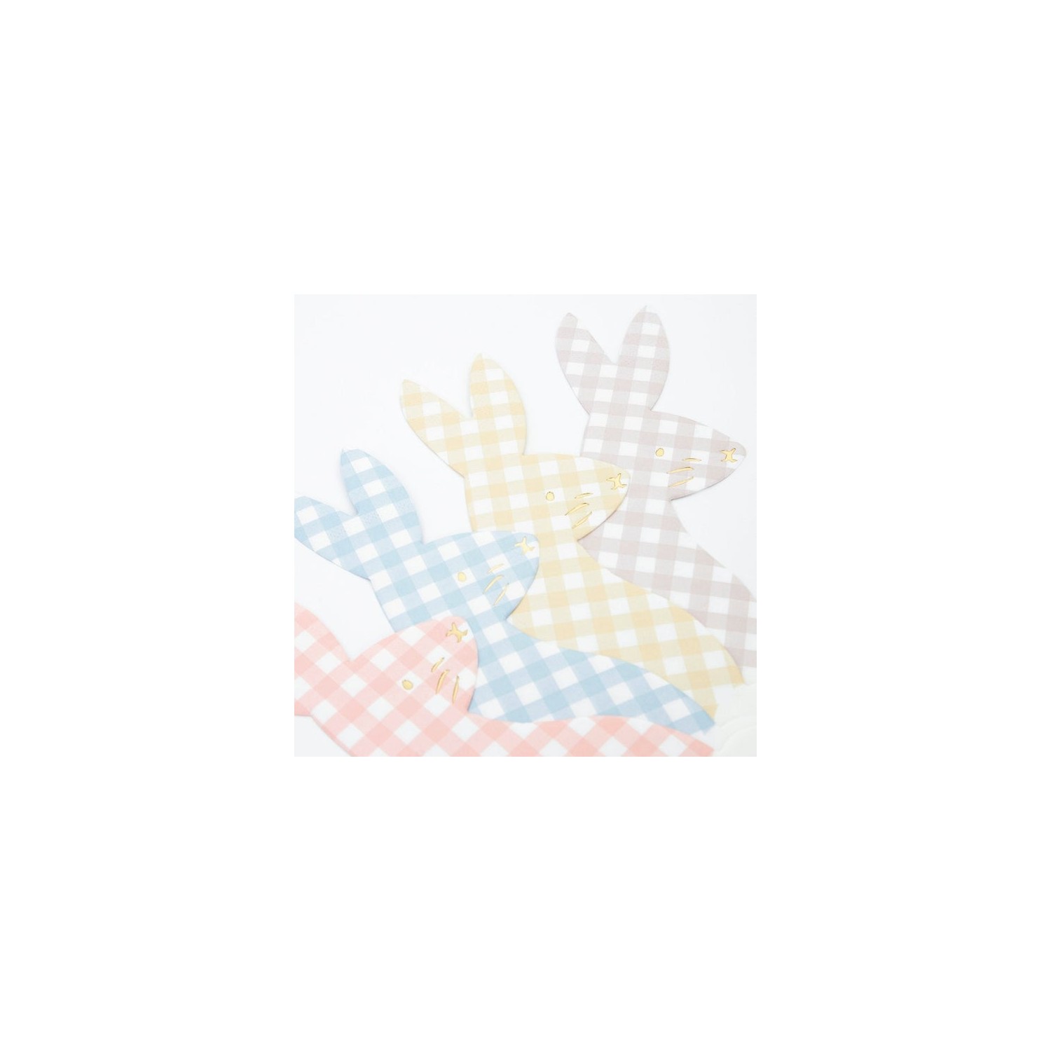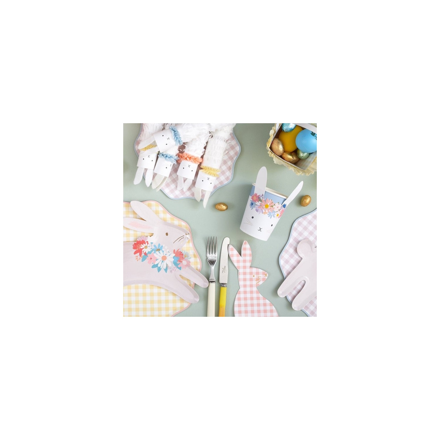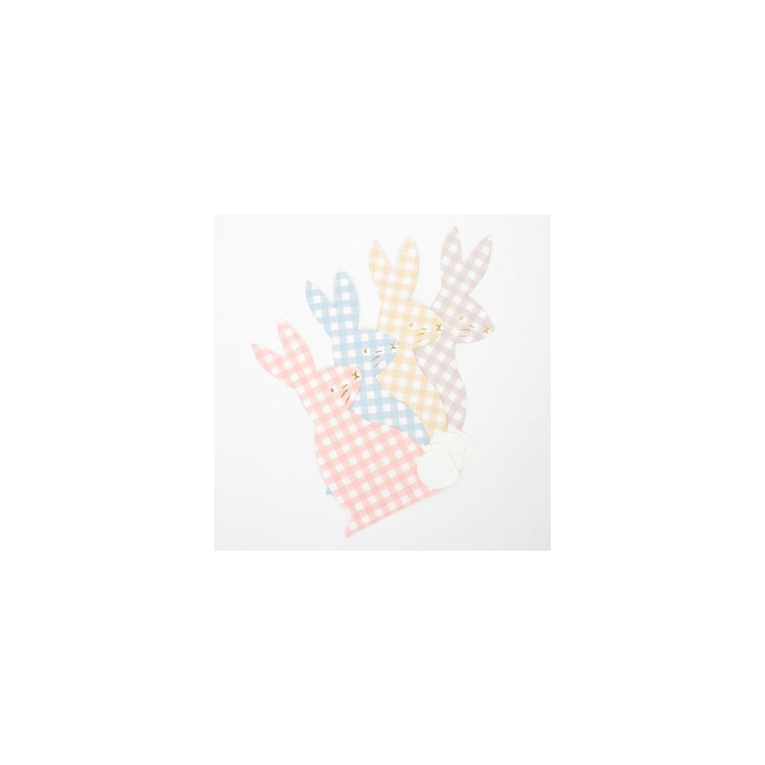 Aggiungi un look simpatico e colorato alla tua tavola di Pasqua o al tuo picnic di primavera in giardino con questi graziosi tovaglioli di carta a forma di coniglietti, decorati con occhietti e baffetti dorati e con una fantasia a quadri in 4 diversi colori: giallo, azzurro, rosa e corallo.