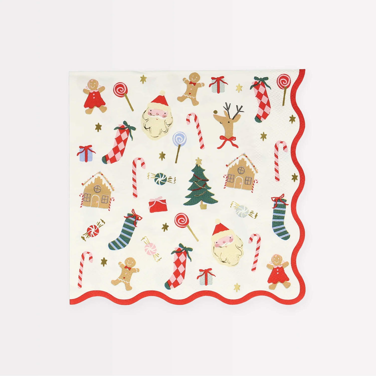 Tovaglioli di carta quadrati con bordatura rossa e disegni a tema natalizio, perfetti per decorare la tavola durante le feste. Confezione da 16.