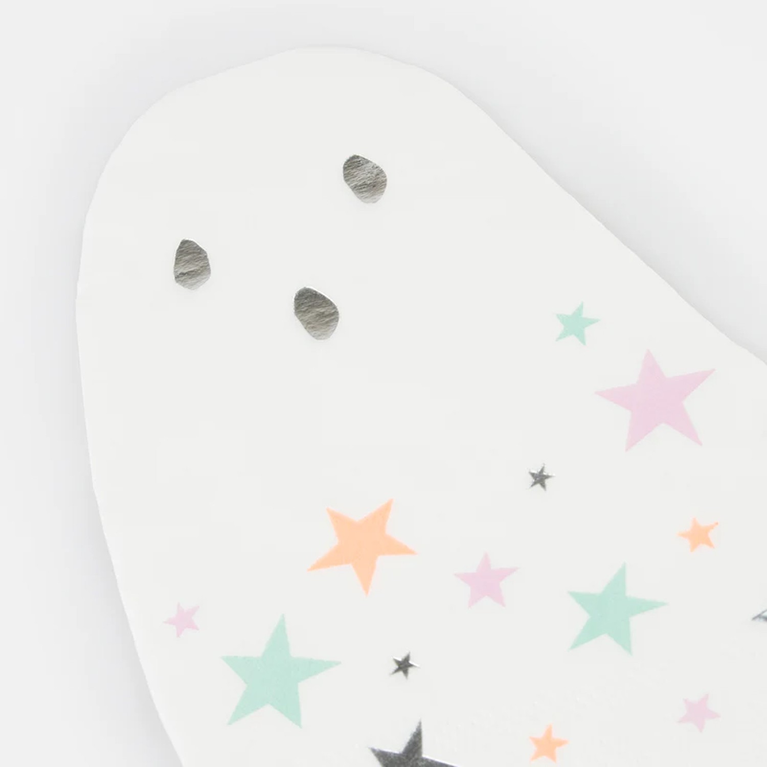 Tovaglioli di carta a forma di simpatico fantasmino, perfetti per donare un tocco di lucentezza alla tua tavola grazie alle decorazioni a forma di colorate stelline e ai dettagli in lamina d'argento. Perfetti da abbinare ai nostri piattini a tema.