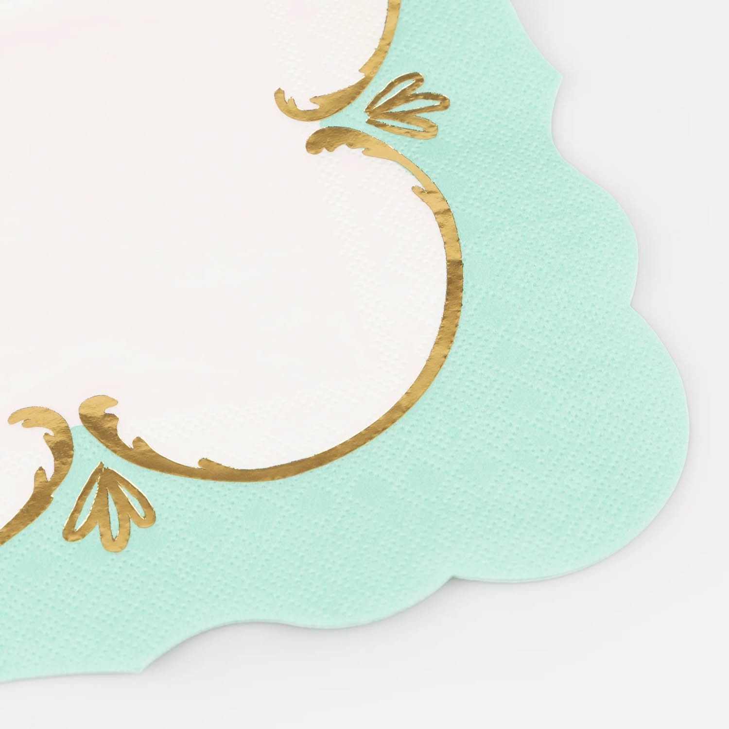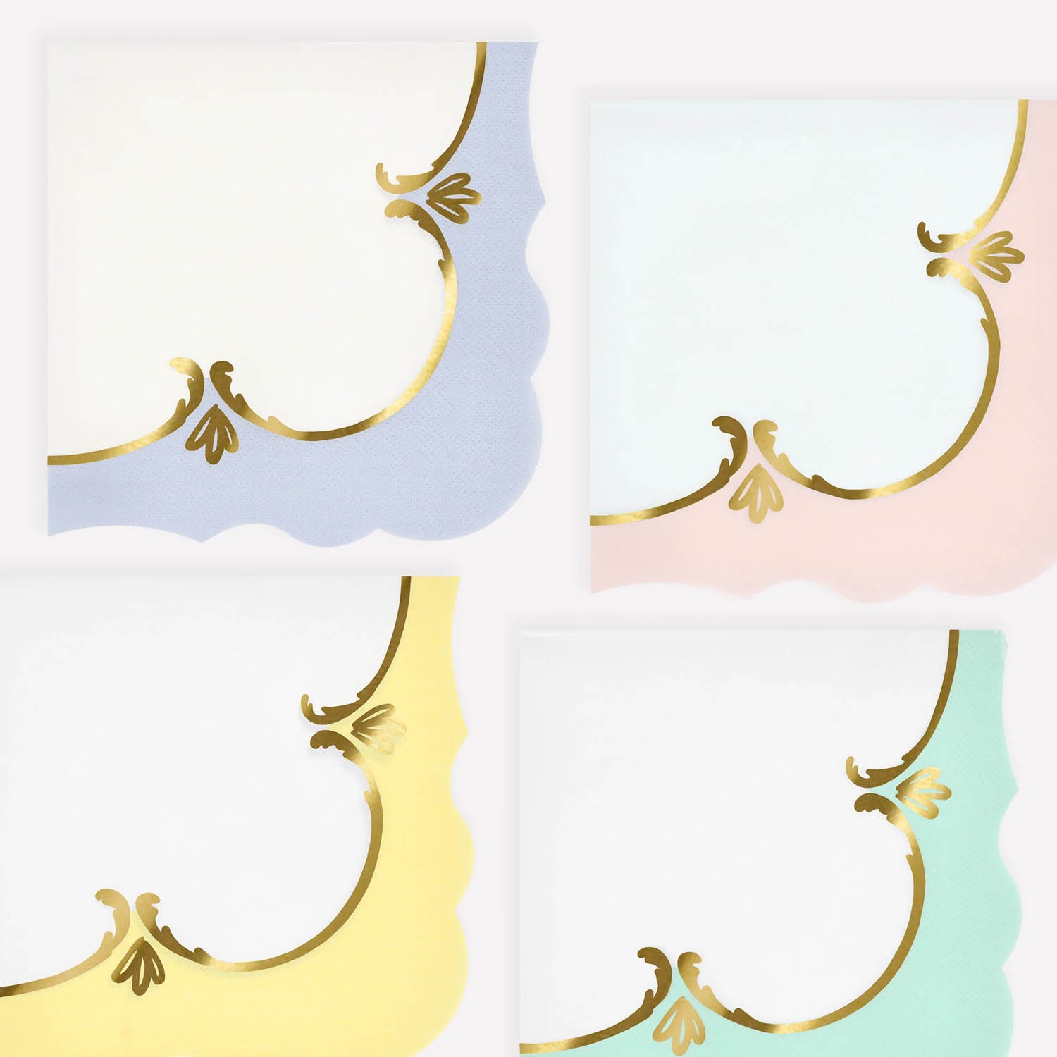 Ispirati all'eleganza ricercata del design rococò, questi tovaglioli sono disponibili in un armonioso mix colorato di blu pastello, rosa, giallo e verde. Presentano un elegante bordo ondulato e dettagli illustrati in lamina dorata lucida, aggiungono un tocco raffinato a qualsiasi tavola. Perfetti per pranzi in giardino, high tea o addii al nubilato, conferiscono un tocco elegante e coordinato alle feste. Realizzati in carta a 3 veli, sono pratici e decorativi.