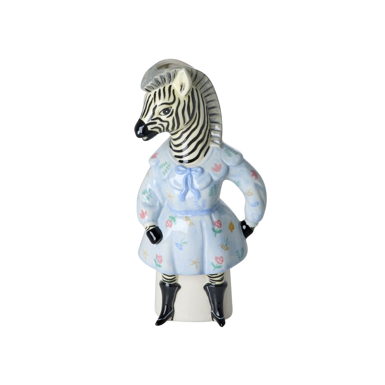 Aggiungi un tocco di eleganza eccentrica alla tua casa con questo originale vaso, frutto della collaborazione tra Rice e la rinomata artista Nathalie Lete. Questo oggetto raffigura una zebra antropomorfa, vestita con un delicato abito azzurro a fiori e stivali neri, che sembra appena uscita da un libro di fiabe. Un vero e proprio pezzo di design che cattura lo sguardo e suscita curiosità. Può essere utilizzato come vaso per fiori freschi o secchi, o come brocca per l'acqua, o semplicemente come oggetto decorativo per arricchire il tuo arredamento.