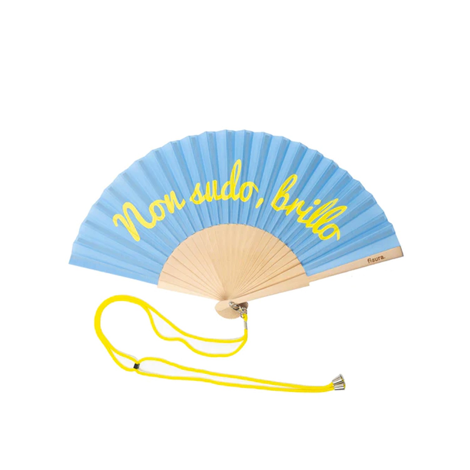 Sconfiggi il calore con questo simpatico ventaglio realizzato in tessuto azzurro e legno, con simpatica scritta gialla neon disegnata "Non sudo, brillo". Ideale per non passare inosservati ad eventi come matrimoni, battesimi e comunioni, o come idea regalo utile ed originale per i tuoi amici e familiari, quando fuori ci saranno 35ºC all'ombra! Inoltre, include un pratico gancio per poterlo avere sempre a portata di mano e non perderlo o dimenticarlo mai. Appendilo e dimenticati di cercarlo nella borsa o nello zaino!