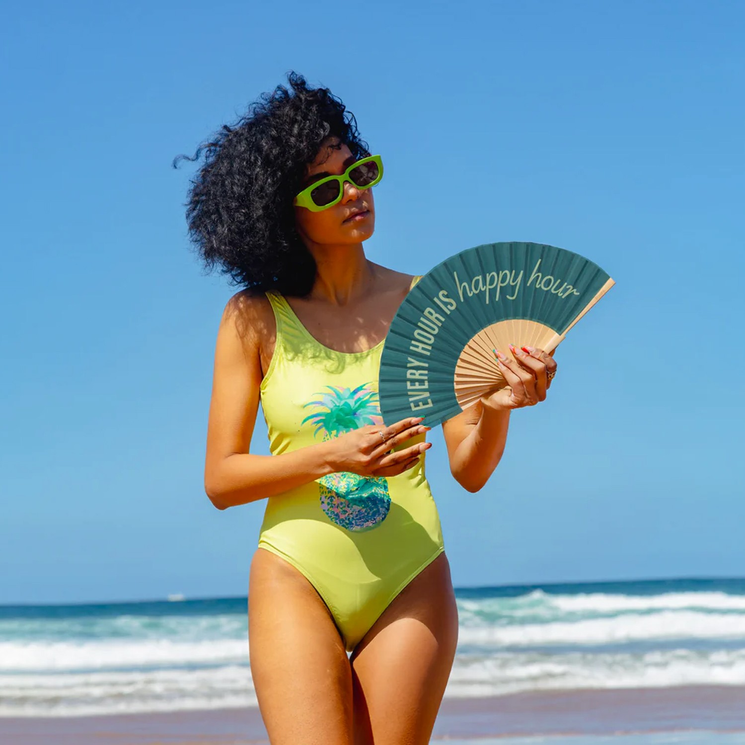 Sconfiggi il calore con questo simpatico ventaglio realizzato in tessuto verde petrolio e legno, con simpatica scritta "Every haour is happy hour".